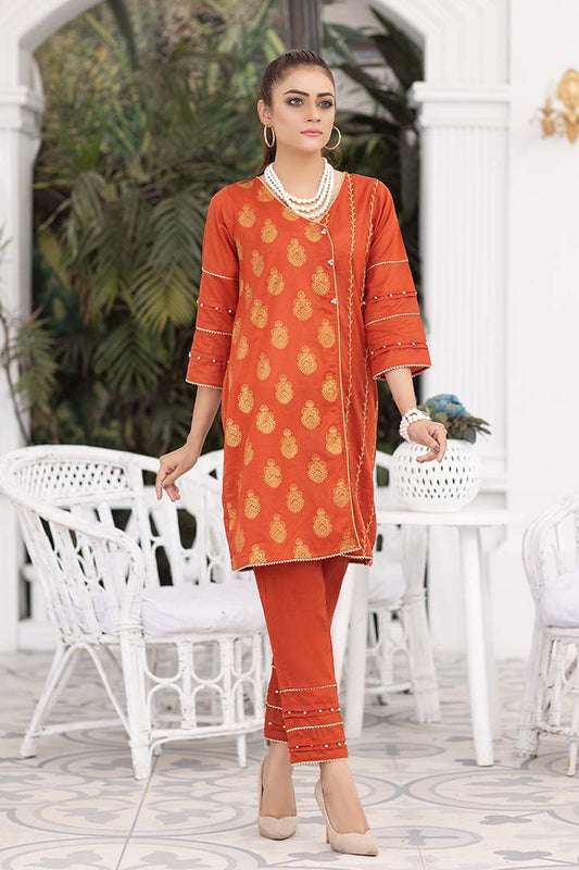 DESCRIPTION: Shirt: Embroidered With Embellishment Fabric: Cotton Color: Rust Shalwar: Elasticated WaistbandFit: RelaxedColor: RustFabric: Cotton ...
