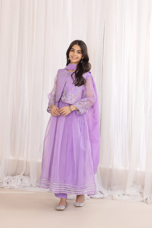DESCRIPTION: Jacket: Embroidered With Embellishment Fabric: Organza Color: Lilac Fit: Regular Frock: Long Frock Embroidery...
