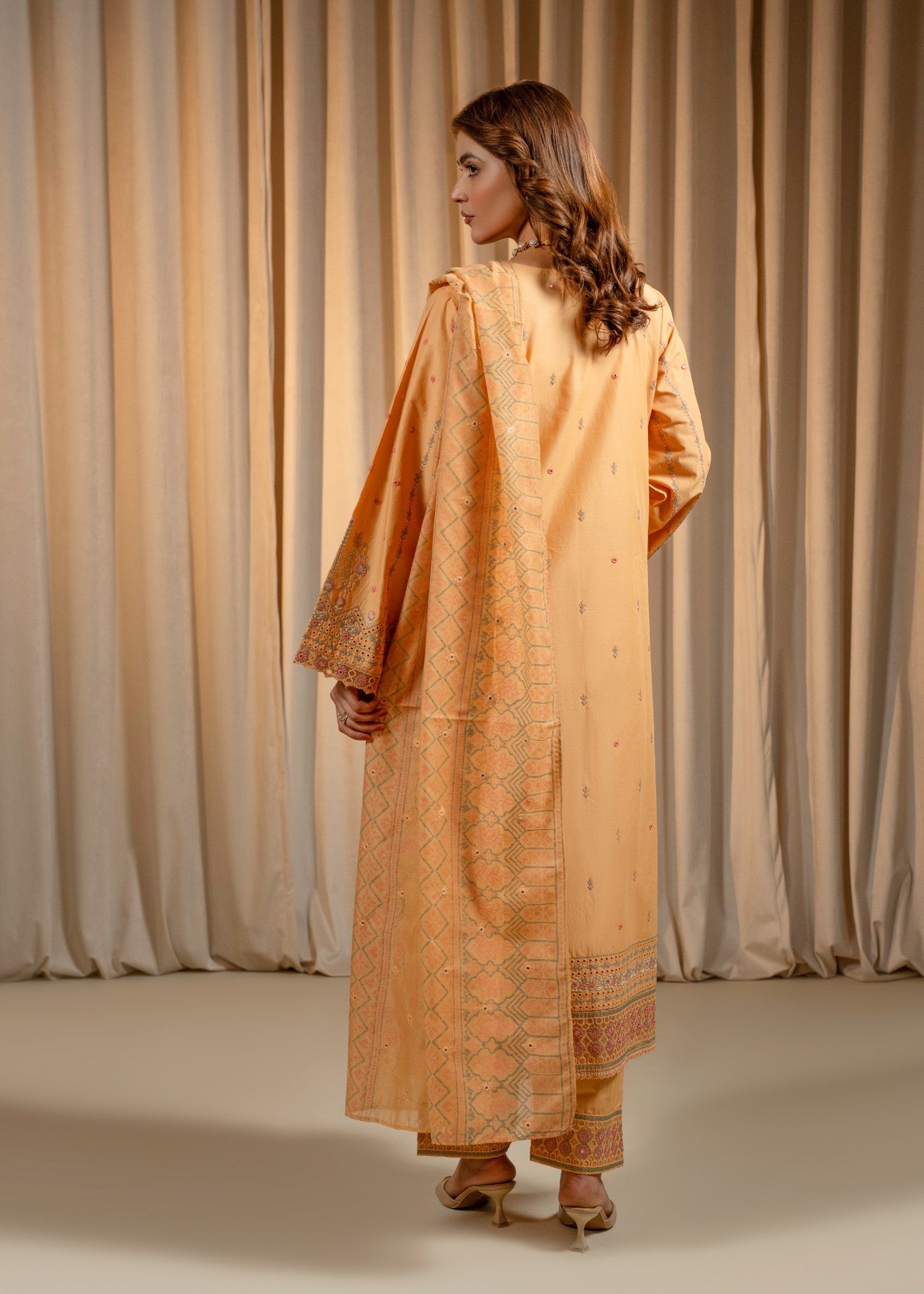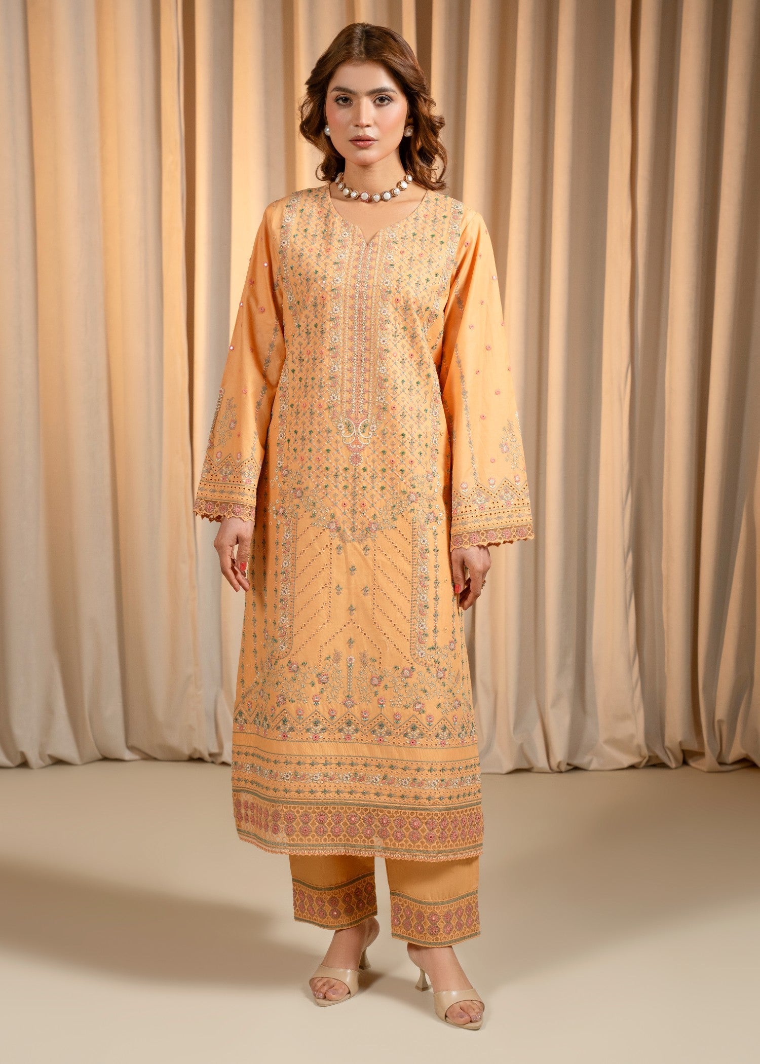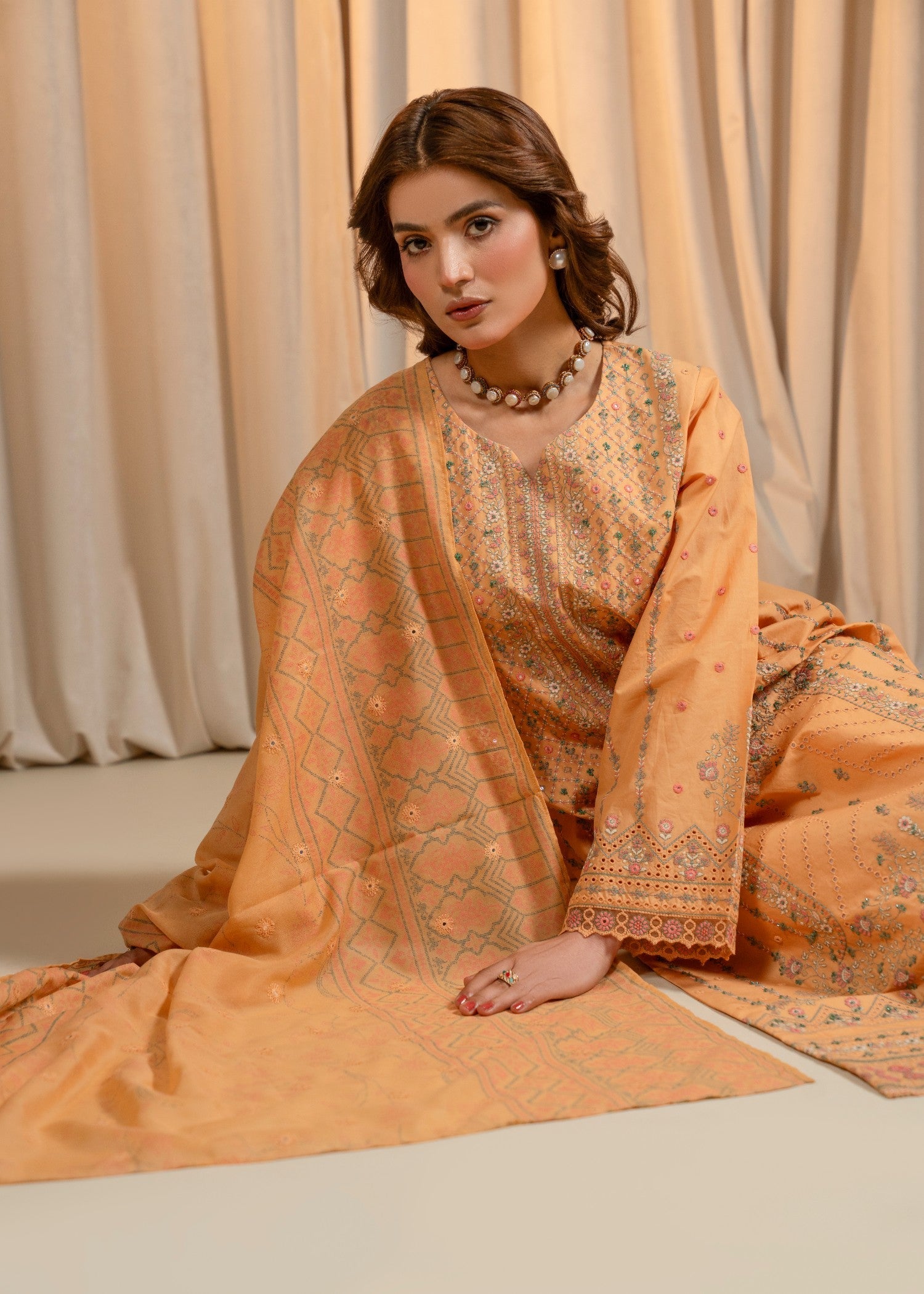 3PC Emb Lawn Apricot – Hand Embell