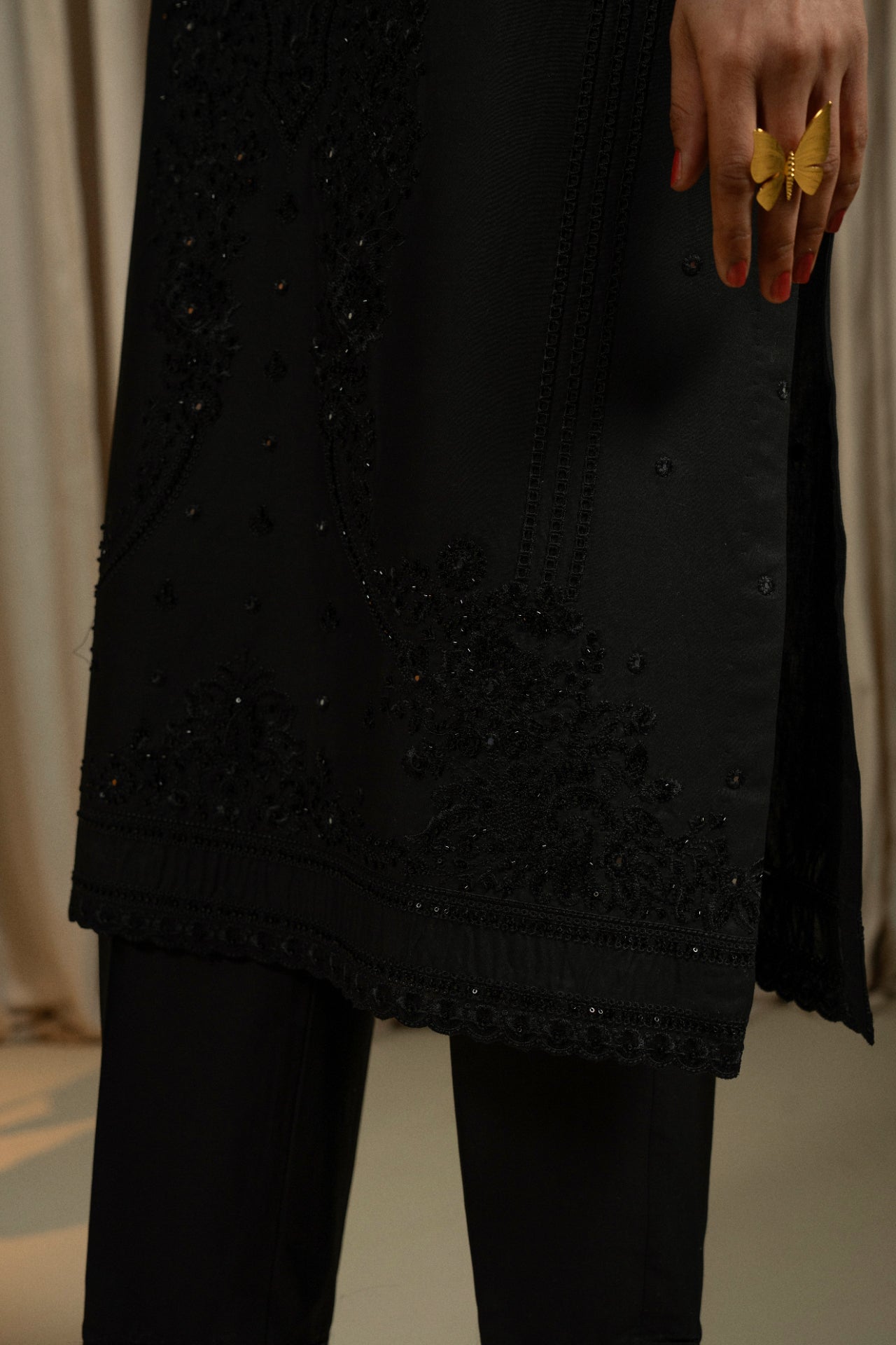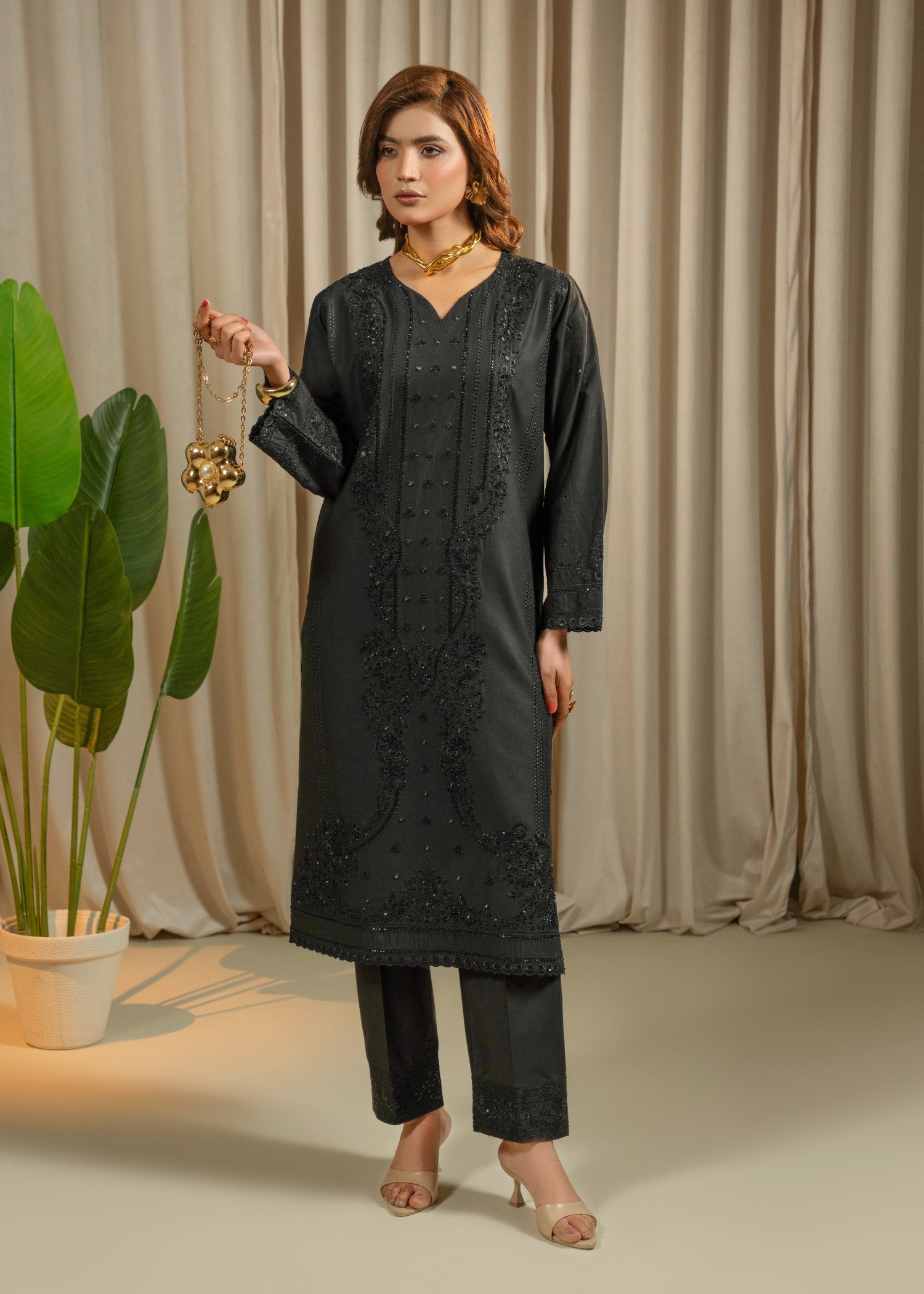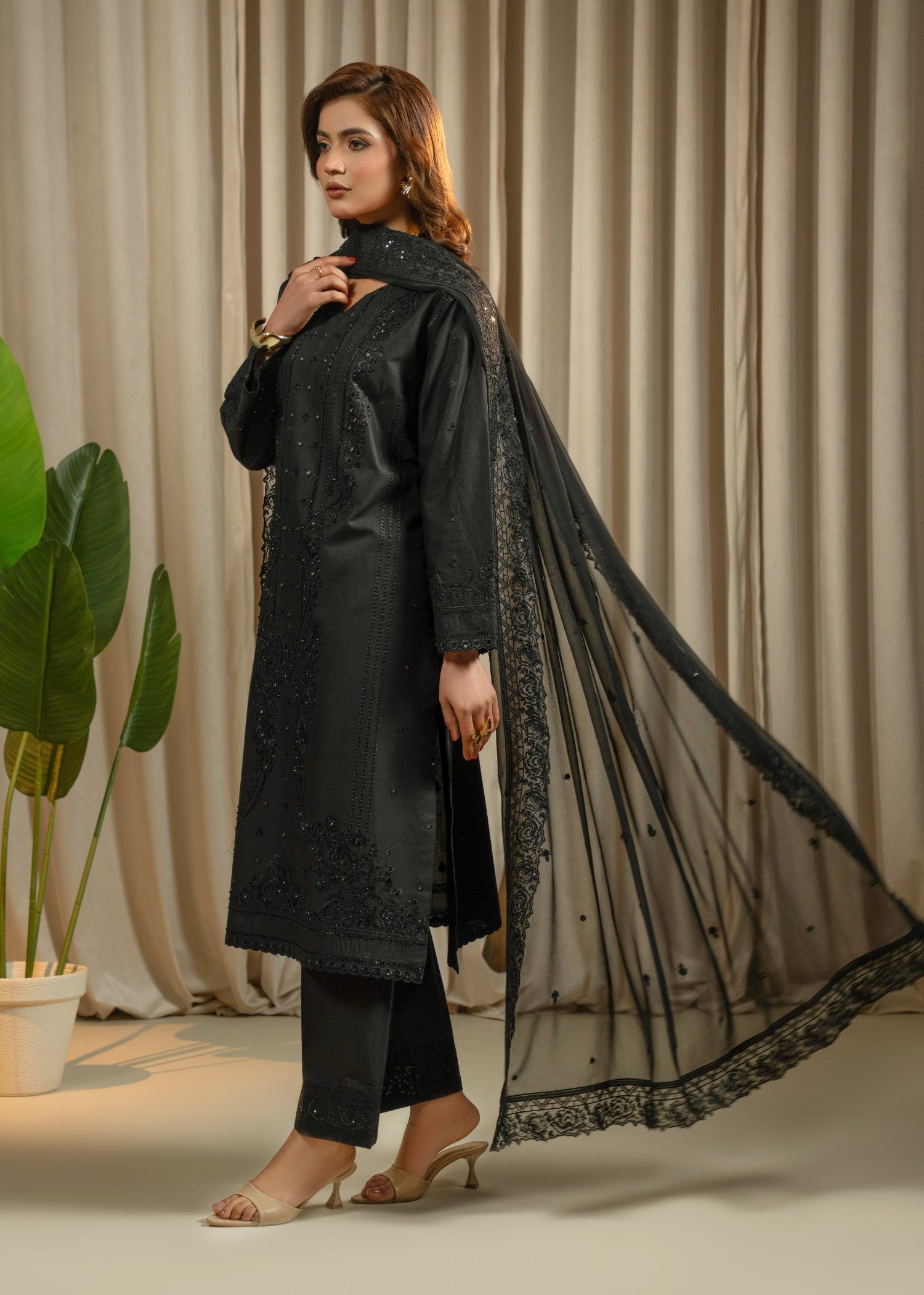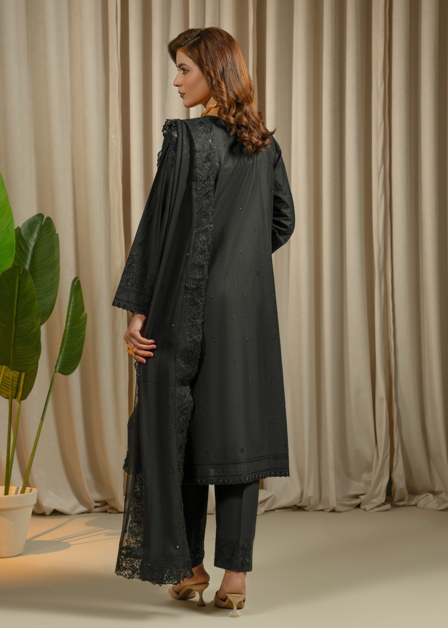 This elegant 3-piece embroidered lawn suit is designed with a focus on fine craftsmanship and graceful detailing. The shirt features delicate floral embroidery, beautifully enhanced with hand embellishments including stones, pearls, and subtle sequins, creating a refined festive look without being overdone. Intricate detailing on the sleeves and hem adds depth and charm to the design.