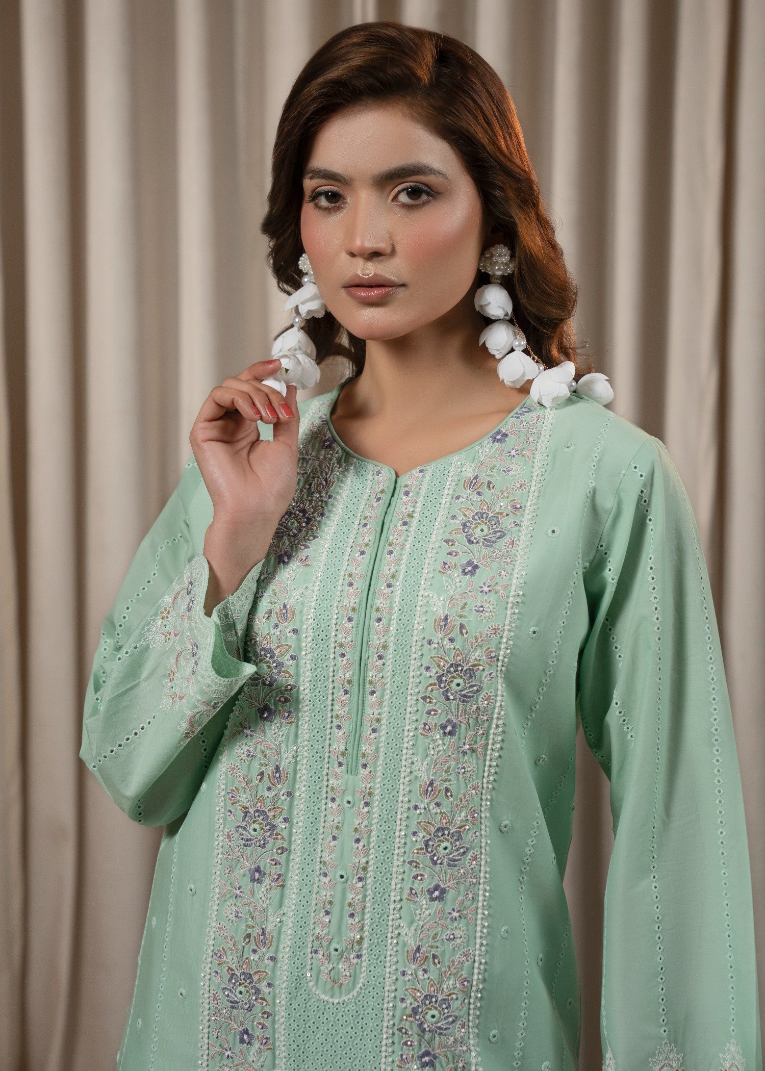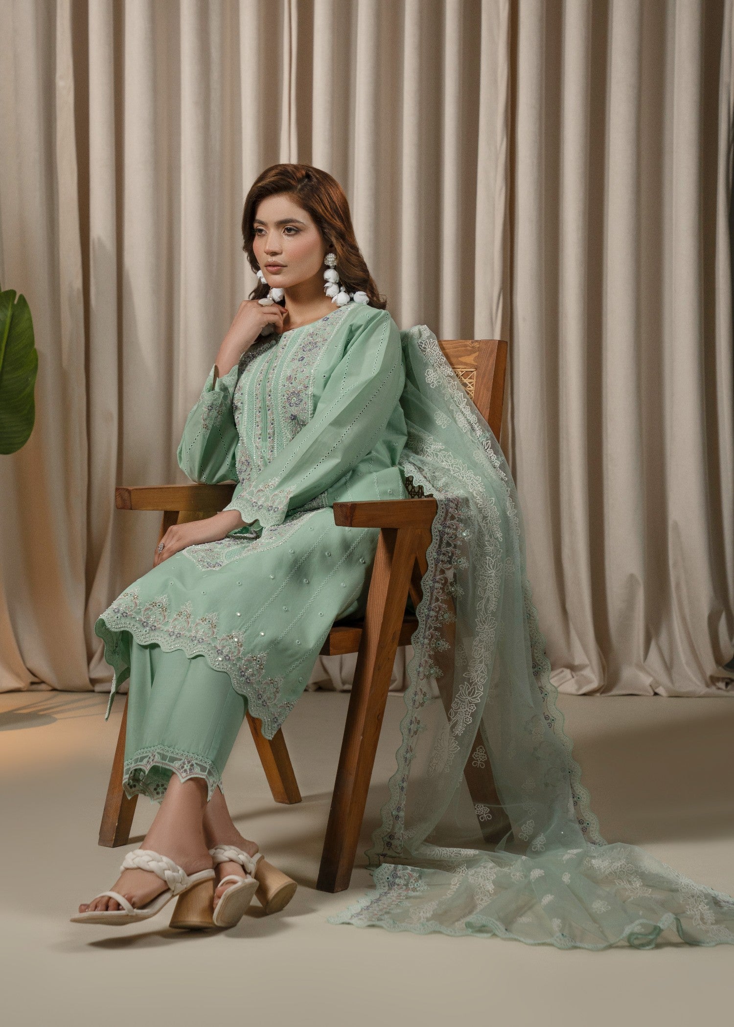 This exquisite Festive/Party Wear Kurta Set in moss green features Adda Work detailing on a Lawn A-Line Kurta. The straight Trouser is made of Lawn, and the Khaddi Net Dupatta adds a touch of elegance. Perfect for summer occasions. Elevate your look with this 3-piece ensemble.