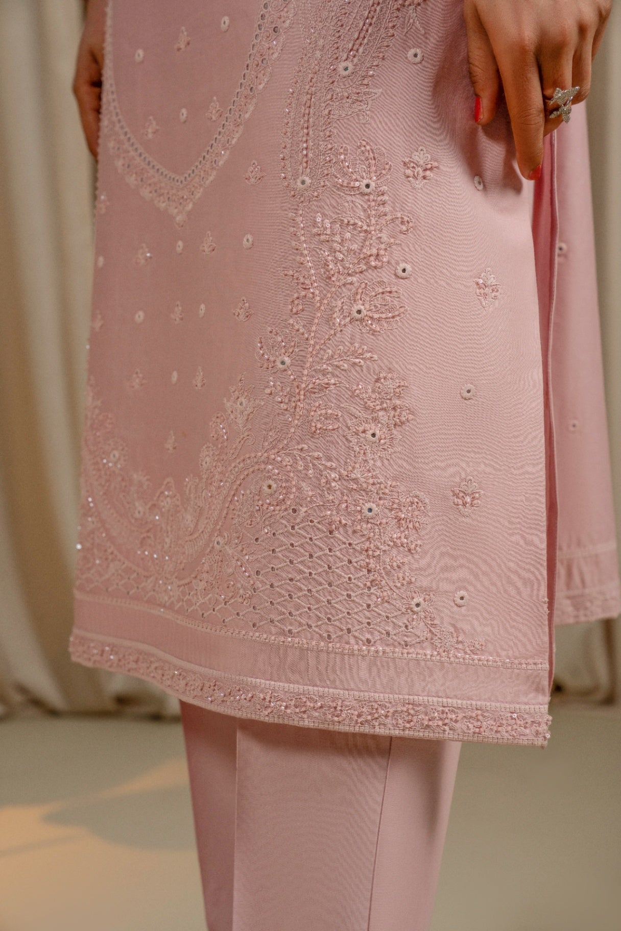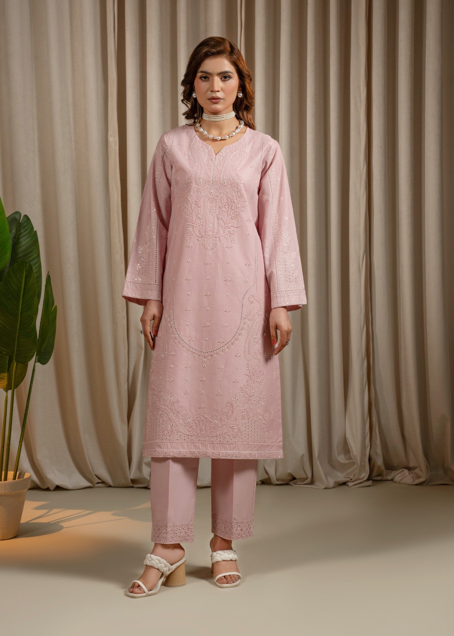 This elegant 3-piece embroidered lawn suit is designed with a focus on fine craftsmanship and graceful detailing. The shirt features delicate floral embroidery, beautifully enhanced with hand embellishments including stones, pearls, and subtle sequins, creating a refined festive look without being overdone. Intricate detailing on the sleeves and hem adds depth and charm to the design.