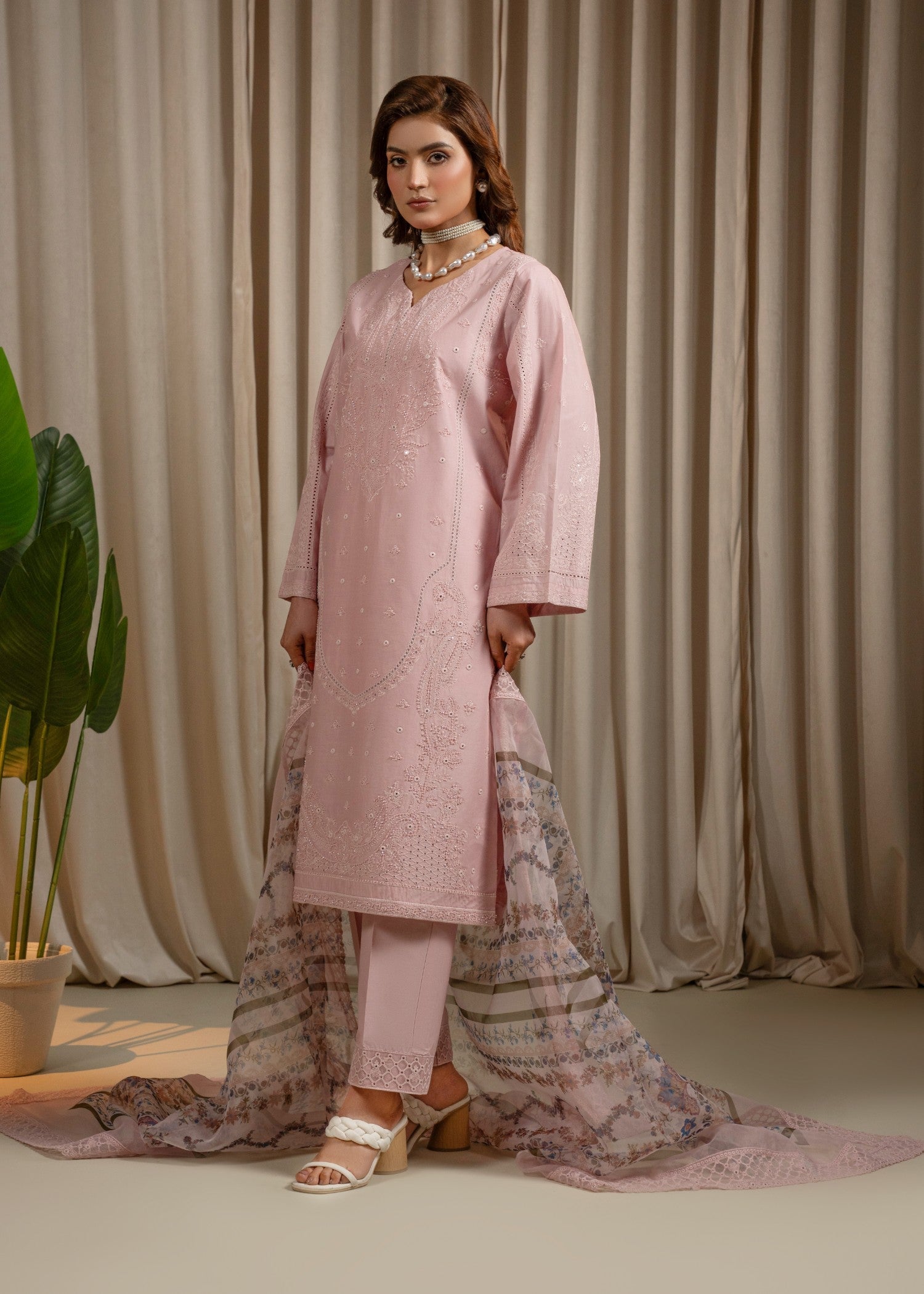 It is paired with a coordinated embroidered lawn trouser and a light, airy chiffon dupatta, finished with delicate lace on all four sides, completing the look with effortless elegance. Perfect for summer festivities, daytime events, and graceful gatherings