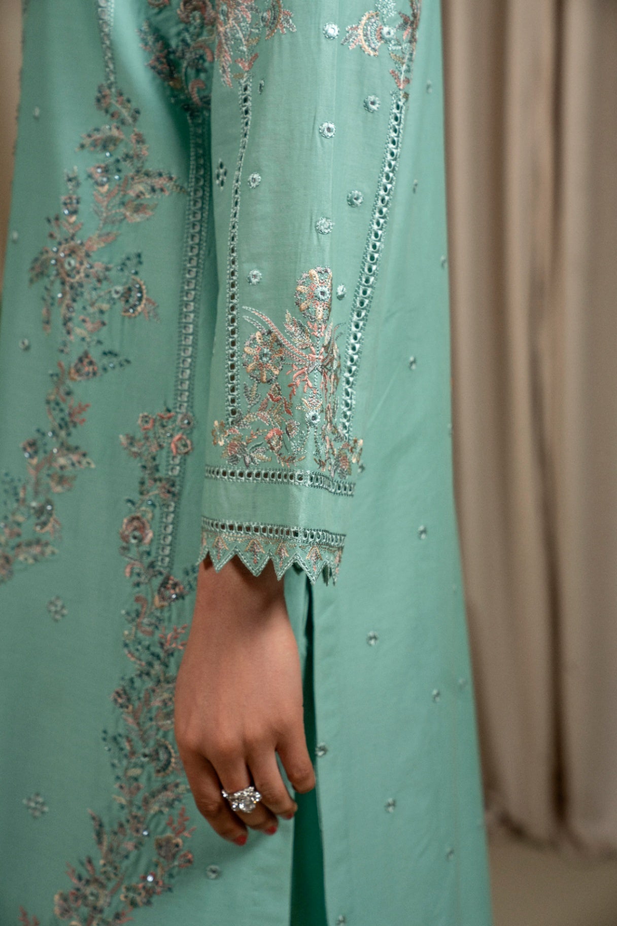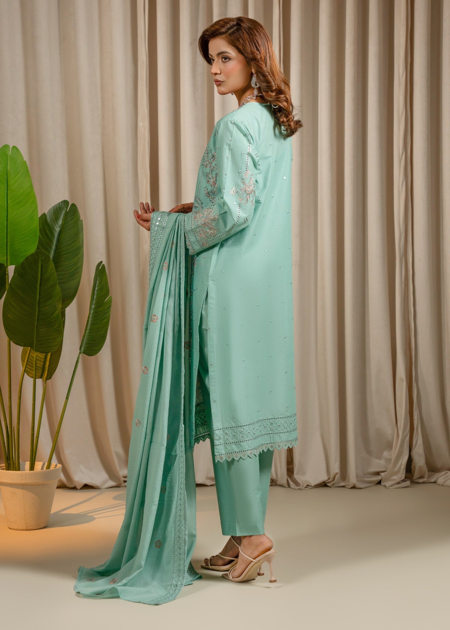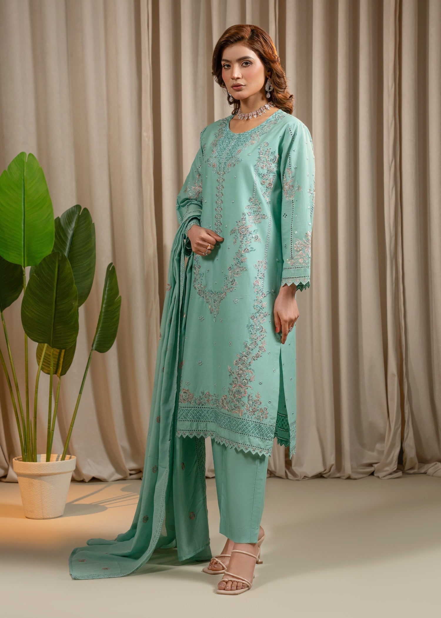 This elegant 3-piece embroidered lawn suit is designed with a focus on fine craftsmanship and graceful detailing. The shirt features delicate floral embroidery, beautifully enhanced with hand embellishments including stones, pearls, and subtle sequins, creating a refined festive look without being overdone. Intricate detailing on the sleeves and hem adds depth and charm to the design.