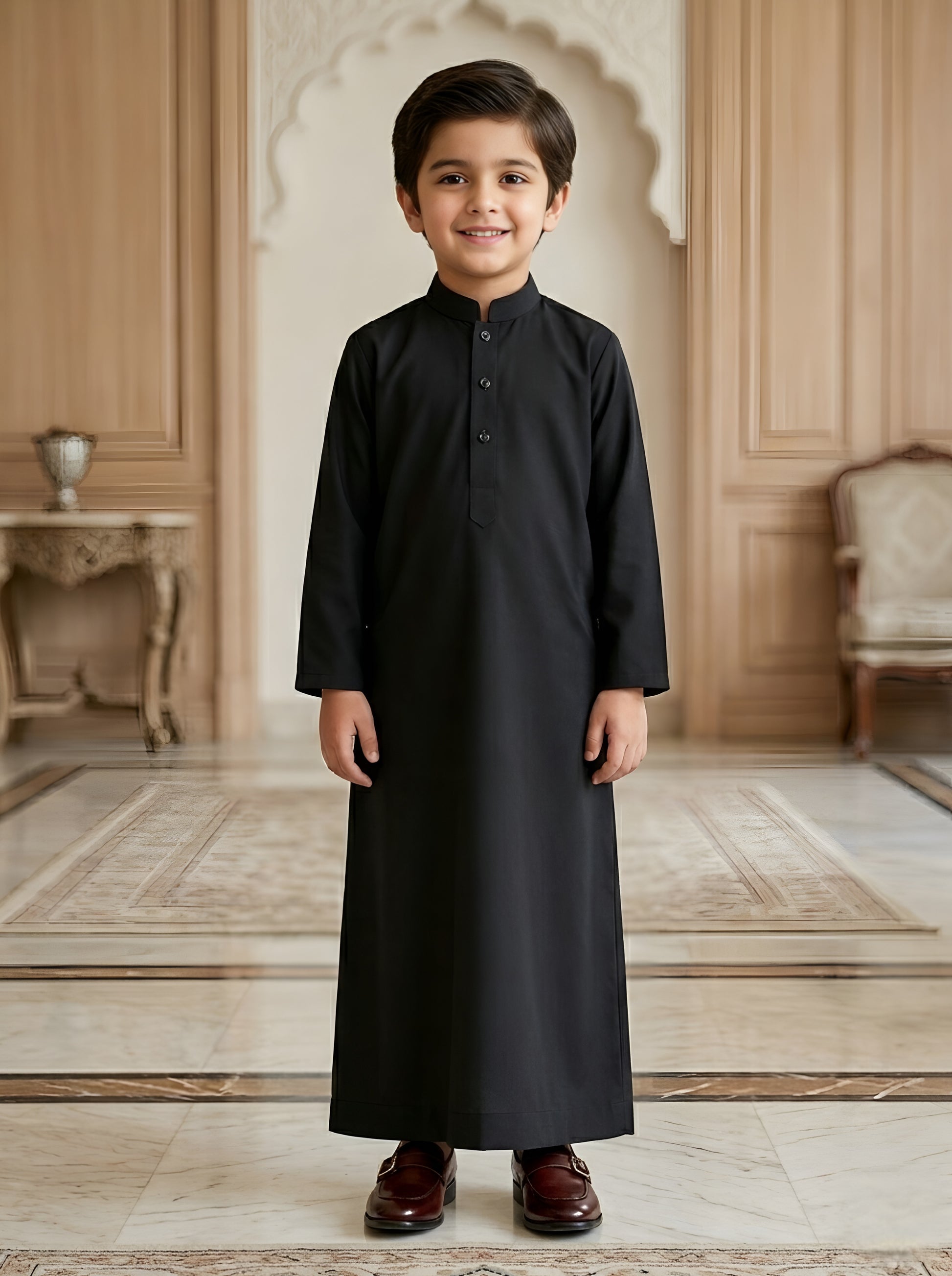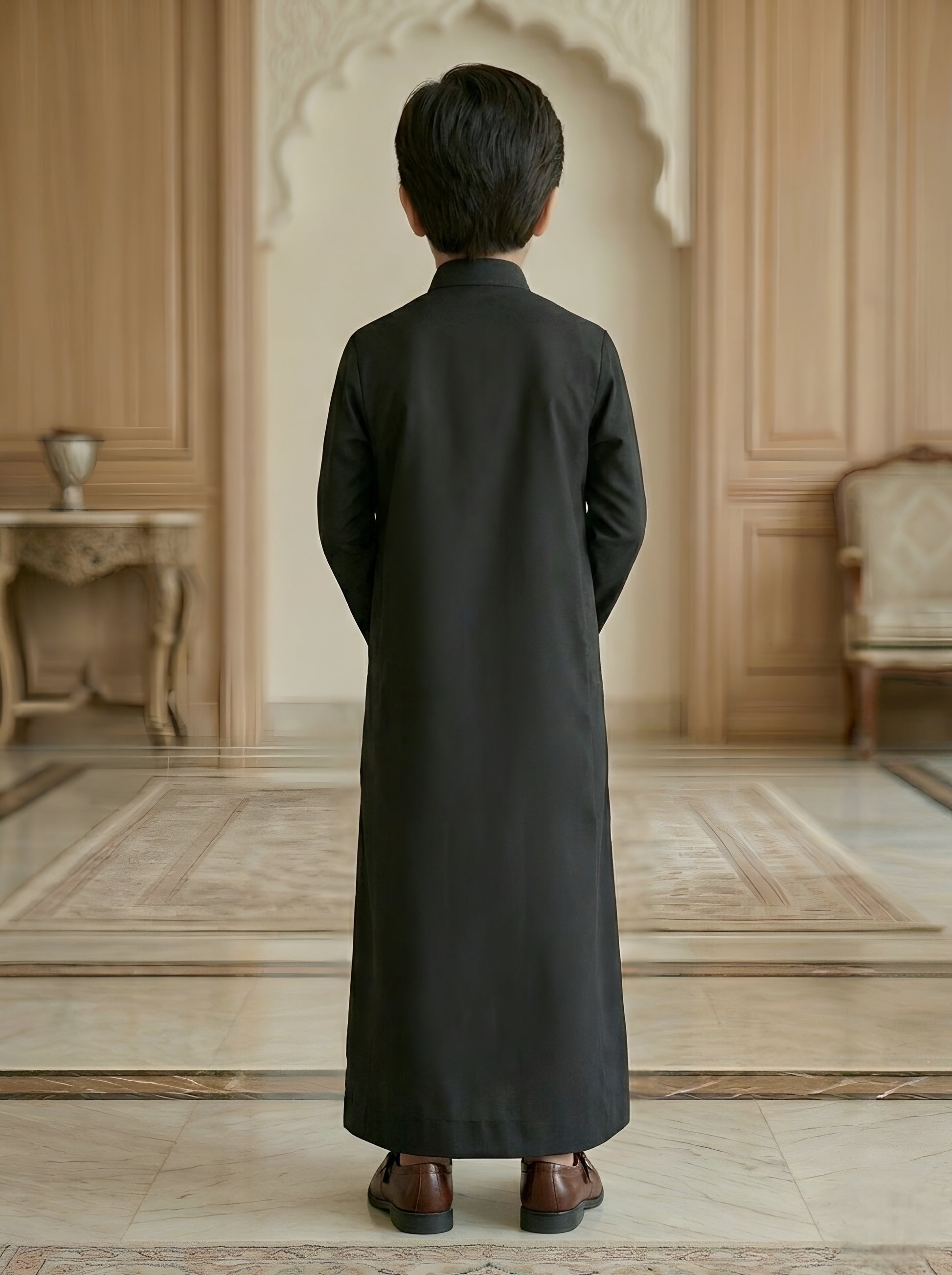 Elevate your child’s wardrobe with the Atif Pasha Black Jubba — a refined blend of traditional elegance and modern convenience. This premium stitched one-piece Arabic thobe is thoughtfully crafted for Eid, Friday prayers, religious gatherings, and formal occasions.