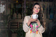 Gold jacqured Stitched Shirt With Multi Color Embroidery on Neckline & Daman With Organza Patching & Printed Chiffon Sleeves.