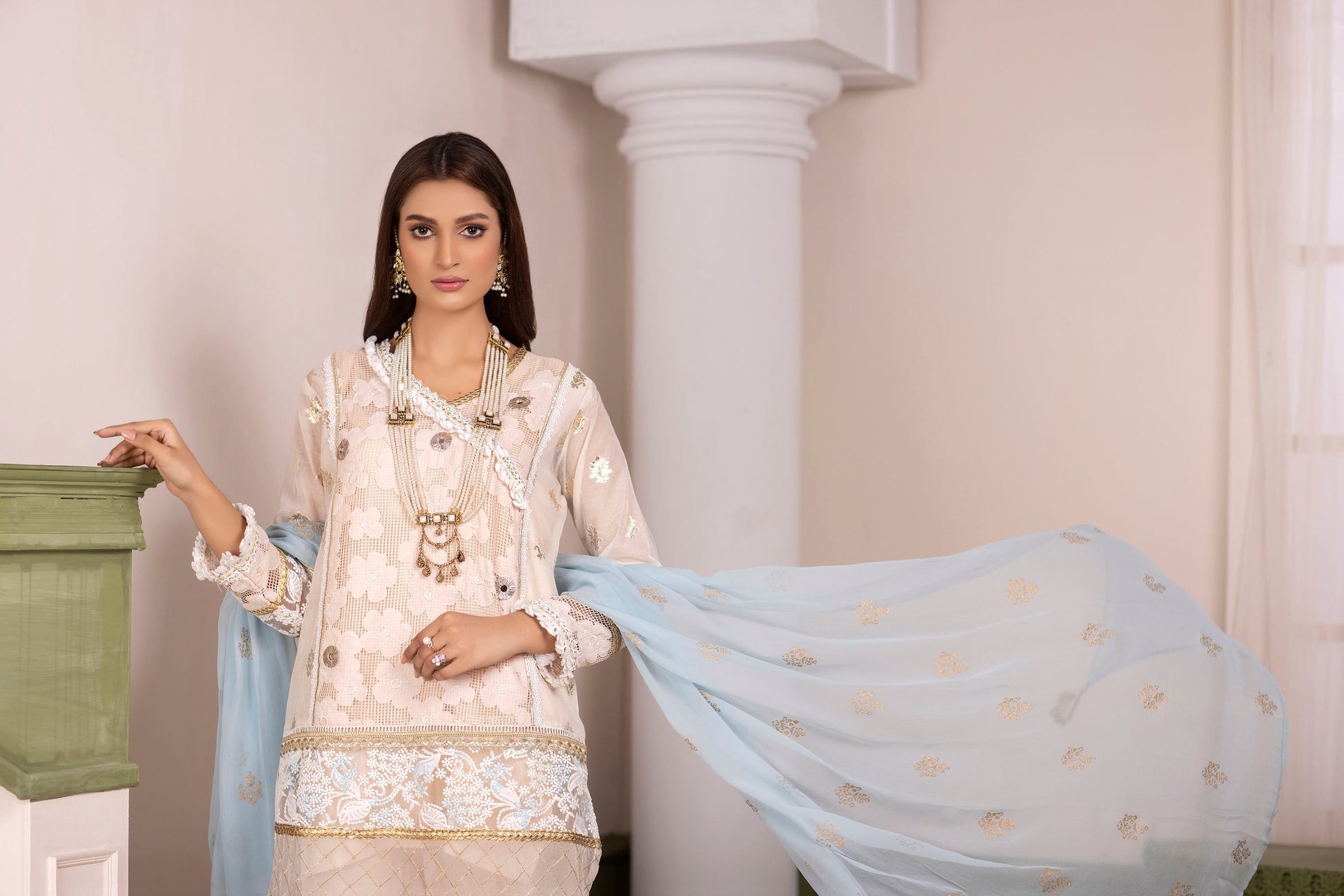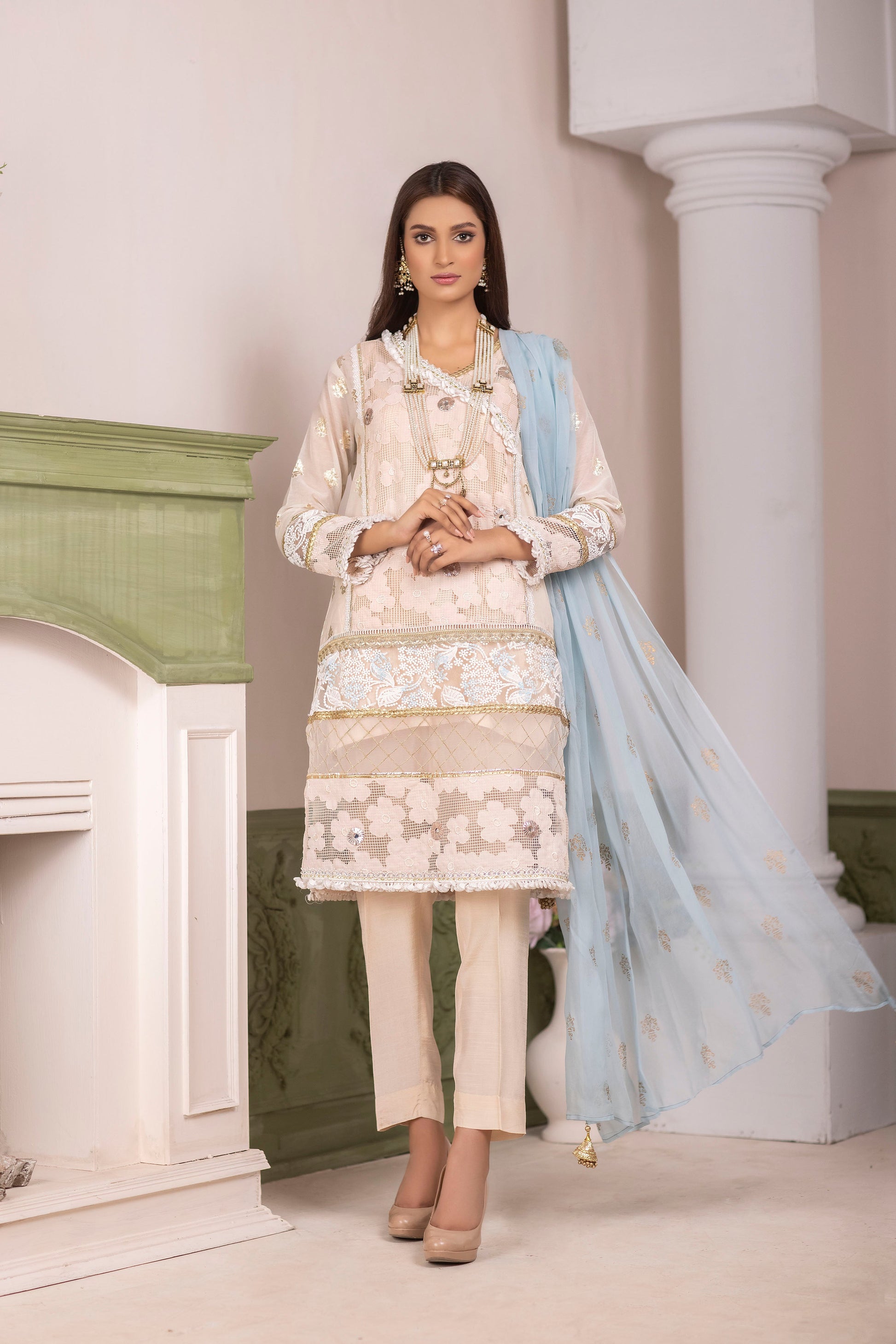 SHIRT: SKIN & WHITE COTTON NET STITCHED SHIRT WITH WORK OF MIRROR LACES , GOTI LACE, WRING MIRROR, AND EMBROIDERED ORGANZA.