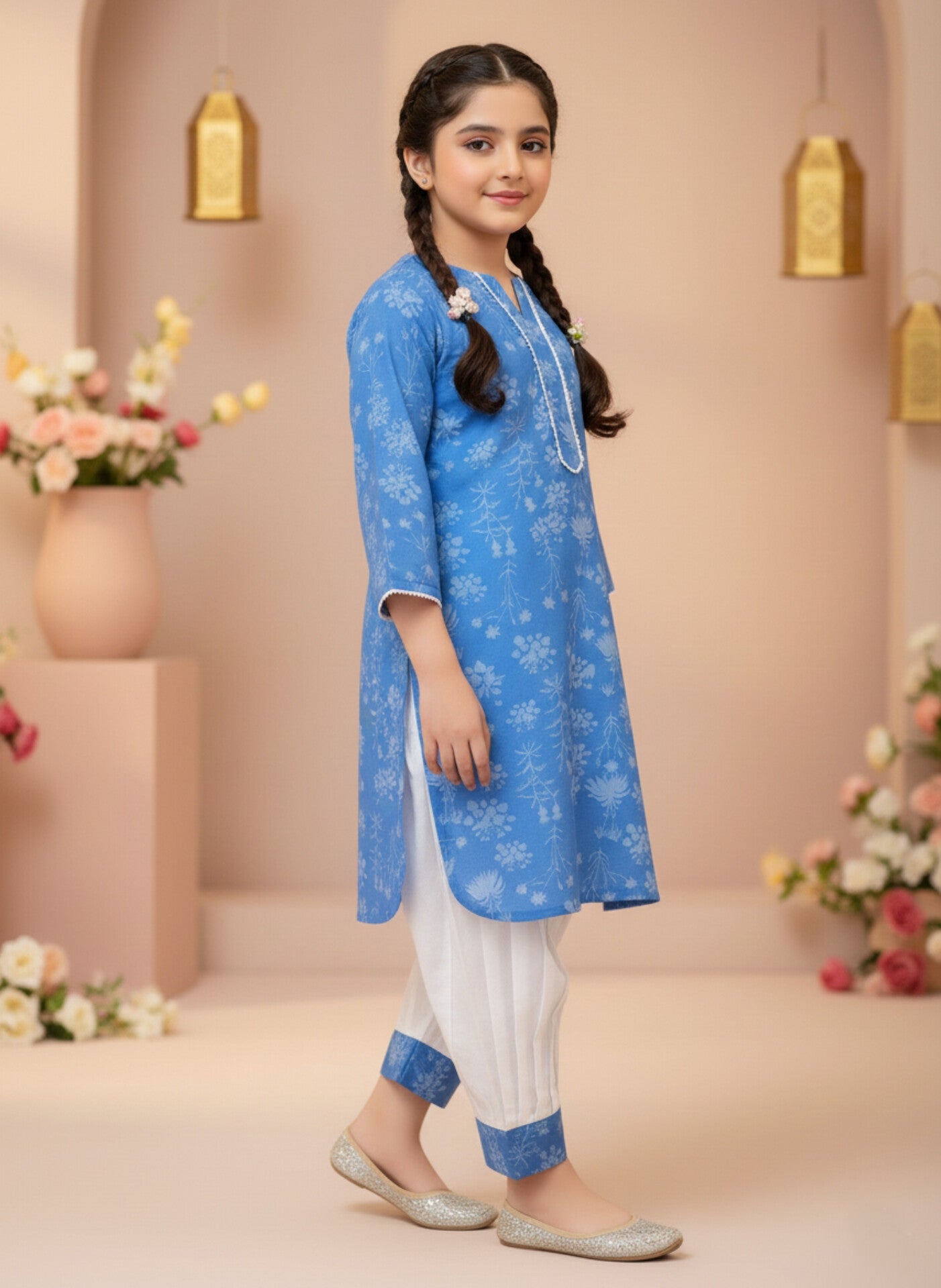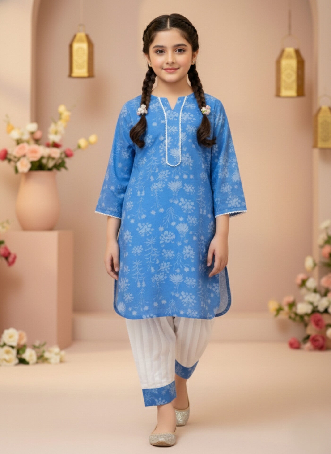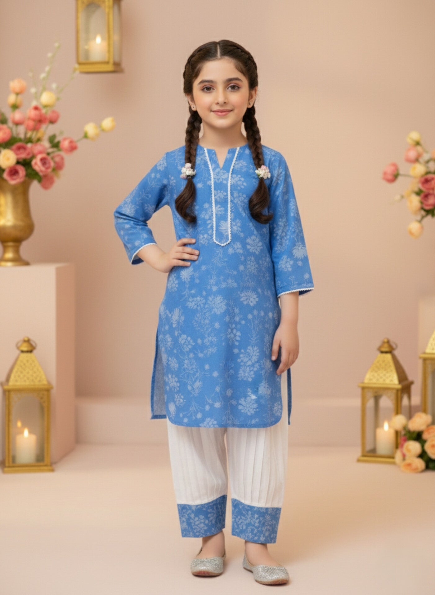 Discover the elegance and beauty of the Azure Afghani Set - the ultimate girls ethnic wear from Sparkles Pret. This traditional Afghani suit, featuring a gorgeous floral kurti and a comfortable salwar, is perfect for any young fashionista. Made with high-quality materials, this Azure blue dress will make your little one stand out in style.Brighten her festive wardrobe with the Azure Afghani Set by Sparkles Pret. This elegant 2-piece girls ethnic outfit features a soft azure blue floral kurti paired with a classic white Afghani salwar. Designed for comfort and style, it’s perfect for Eid, birthdays, family gatherings, and festive occasions.