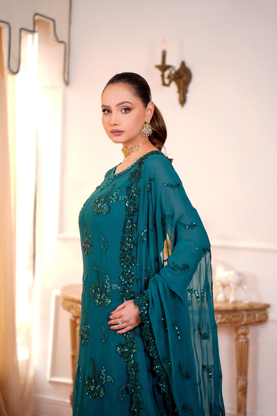 • Shirt Front: Fully hand-embellished luxury chiffon front featuring intricate adda work with elegant stone detailing