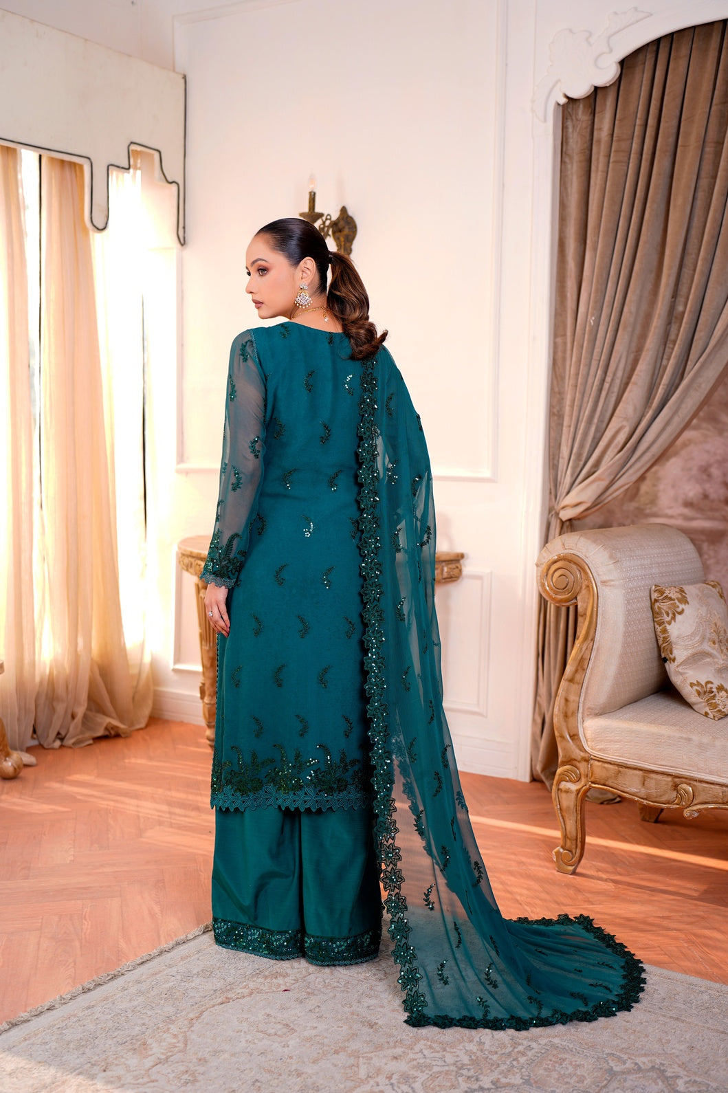 • Dupatta: 2.5 yards embroidered luxury chiffon dupatta with four-sided scalloped borders and lace finish