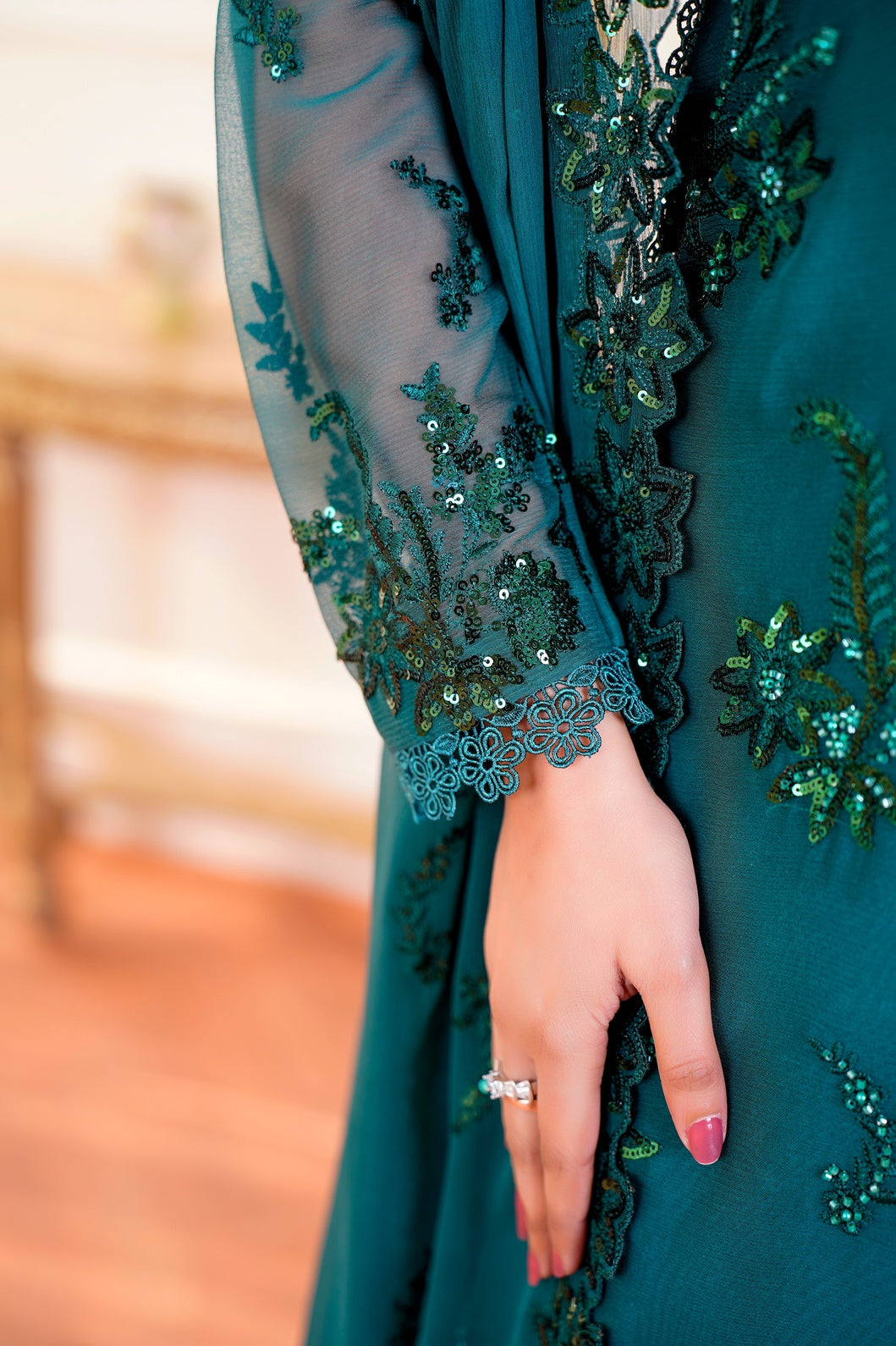 • Sleeves: Exquisitely embroidered chiffon sleeves with fine mesh-work detailing