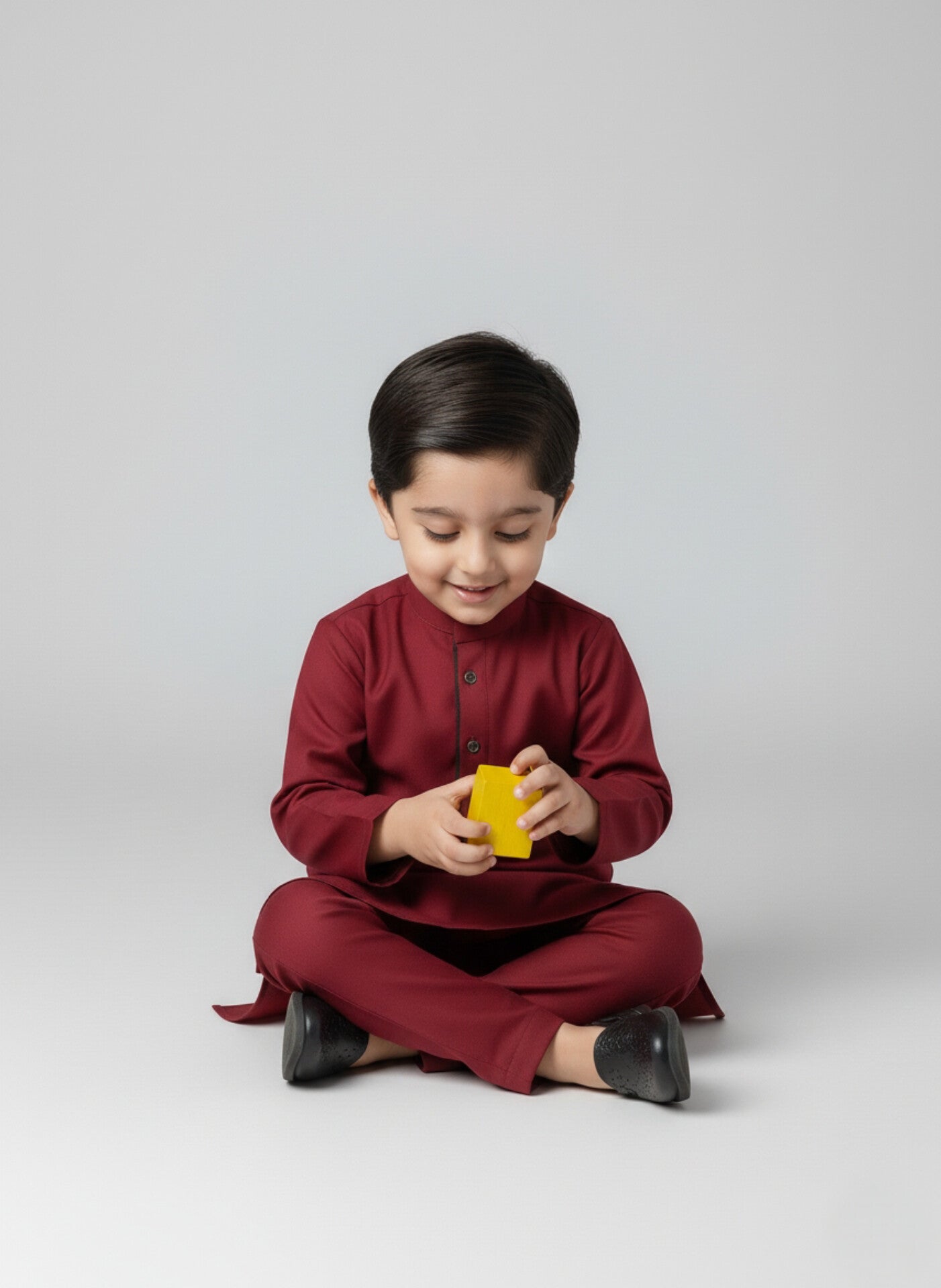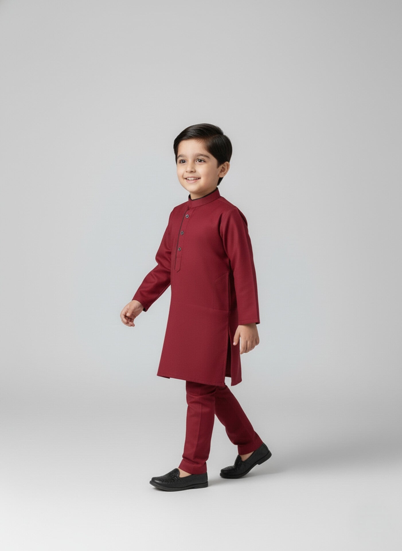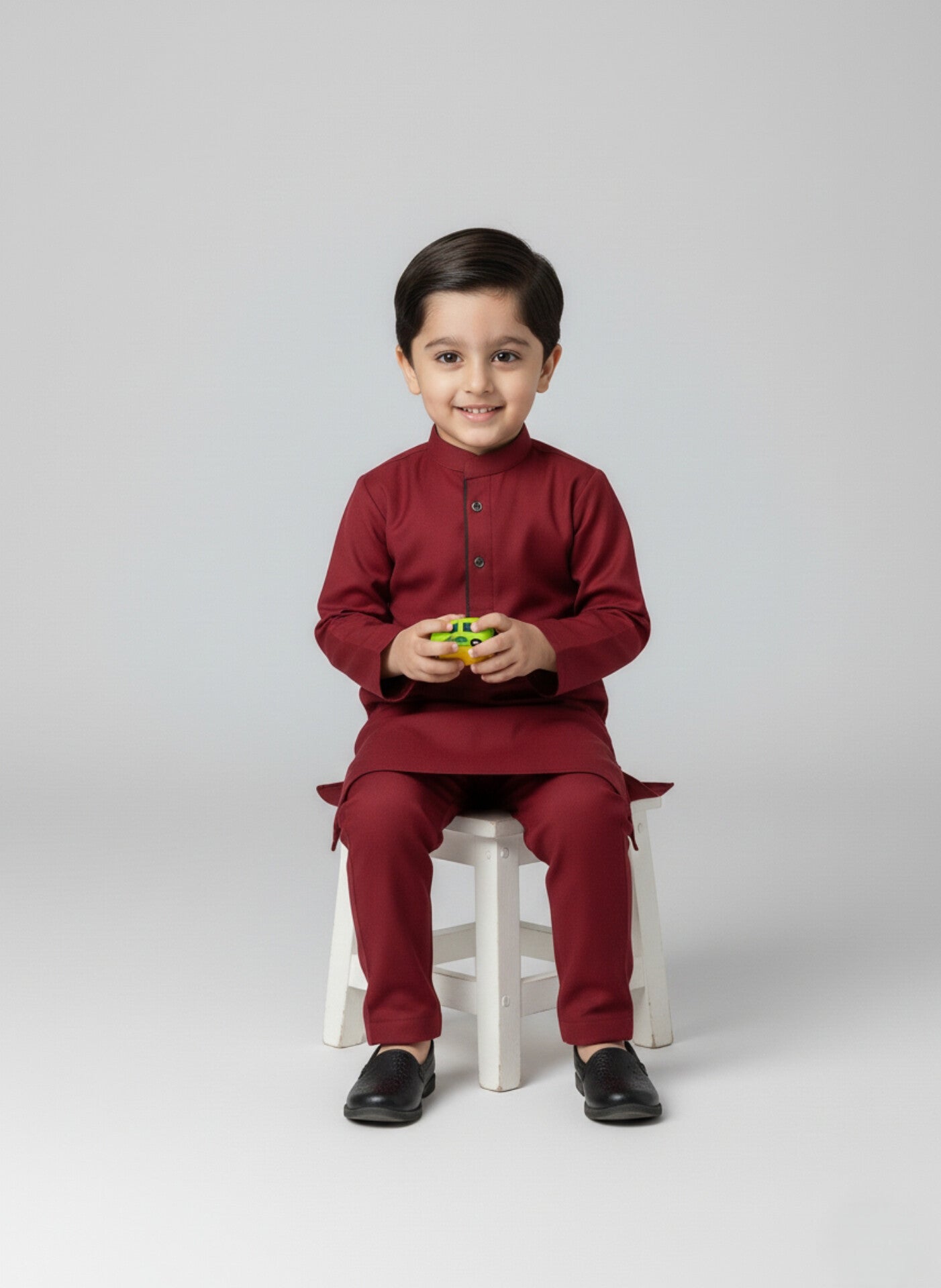 Add a touch of regal charm to your child's winter wardrobe with the Fantasy Kurta Set from Sparkles Pret. This striking Deep Maroon two-piece ensemble is meticulously crafted for the young gentleman who values both effortless style and all-day comfort during the cooler months.