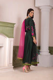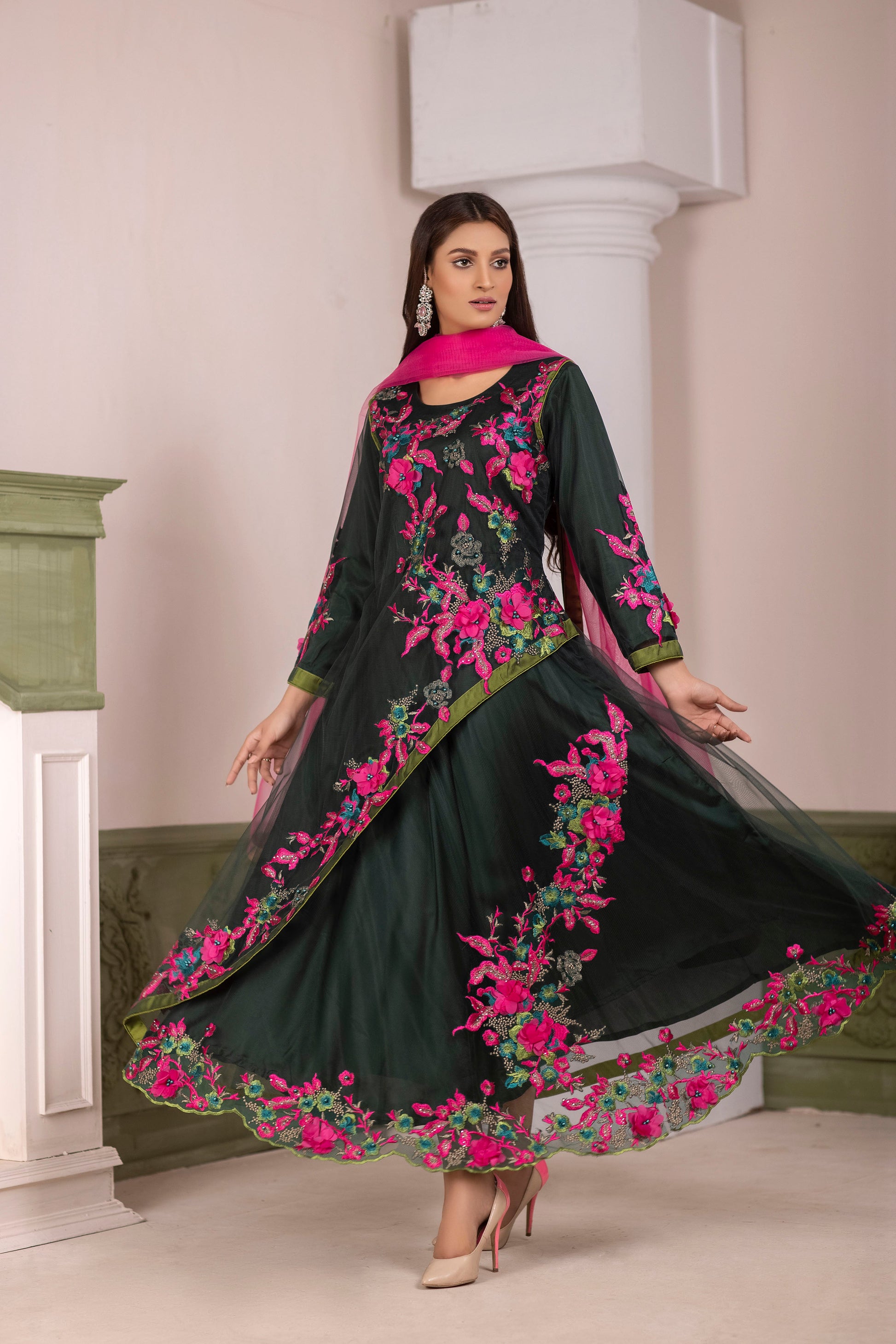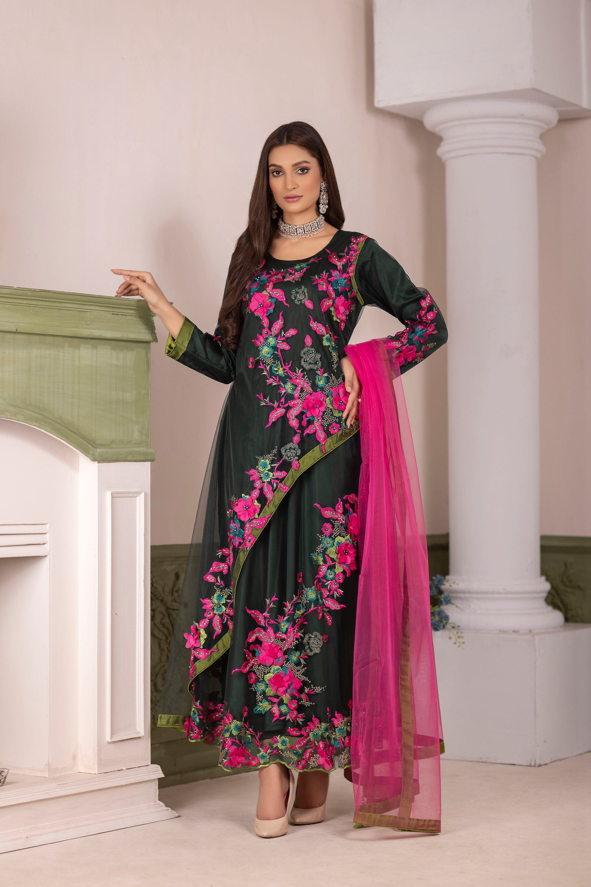 SHIRT: BOTTLE GREEN NET FROCK WITH BEAUTIFUL EMBROIDERY AND LINING ATTACHED.
