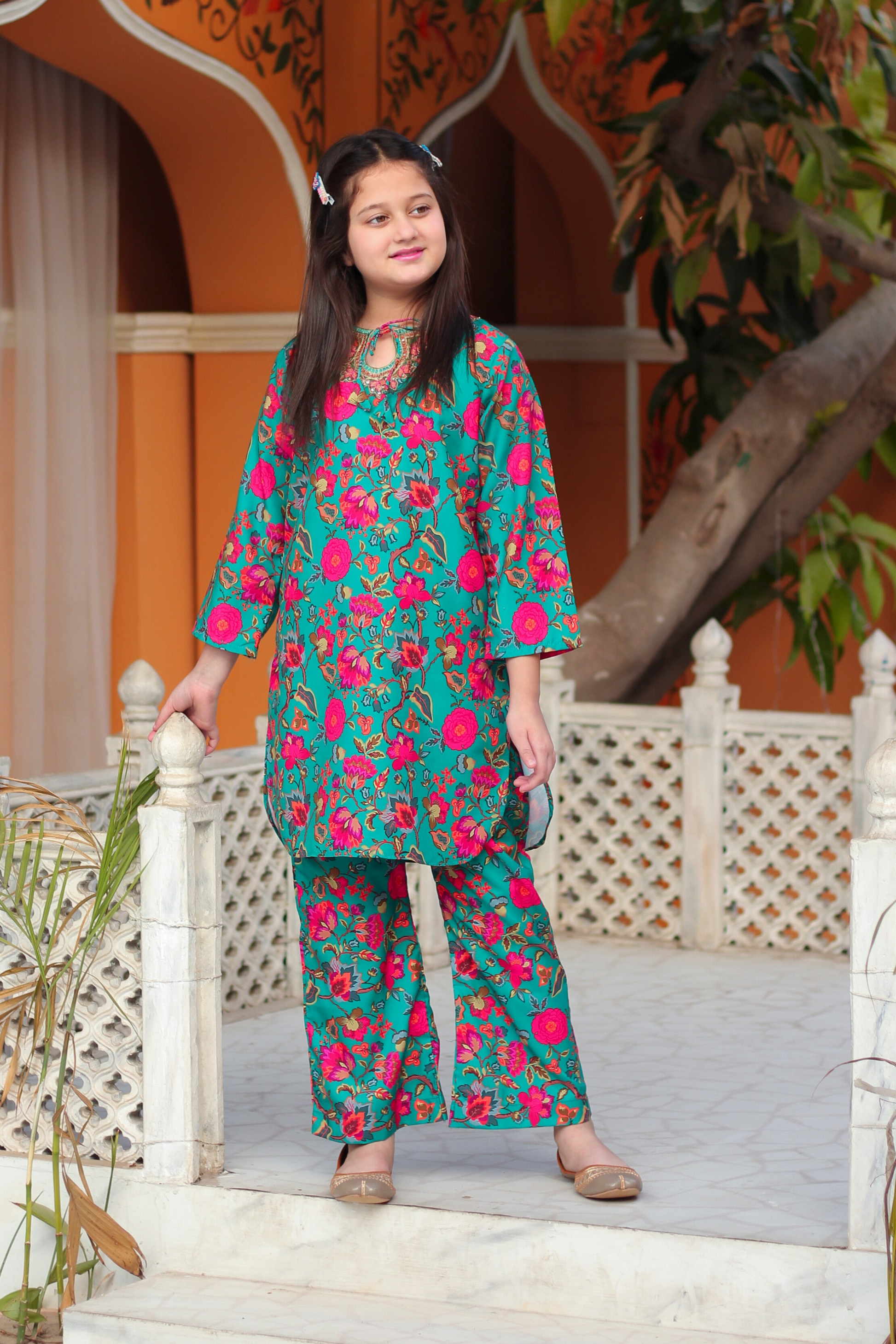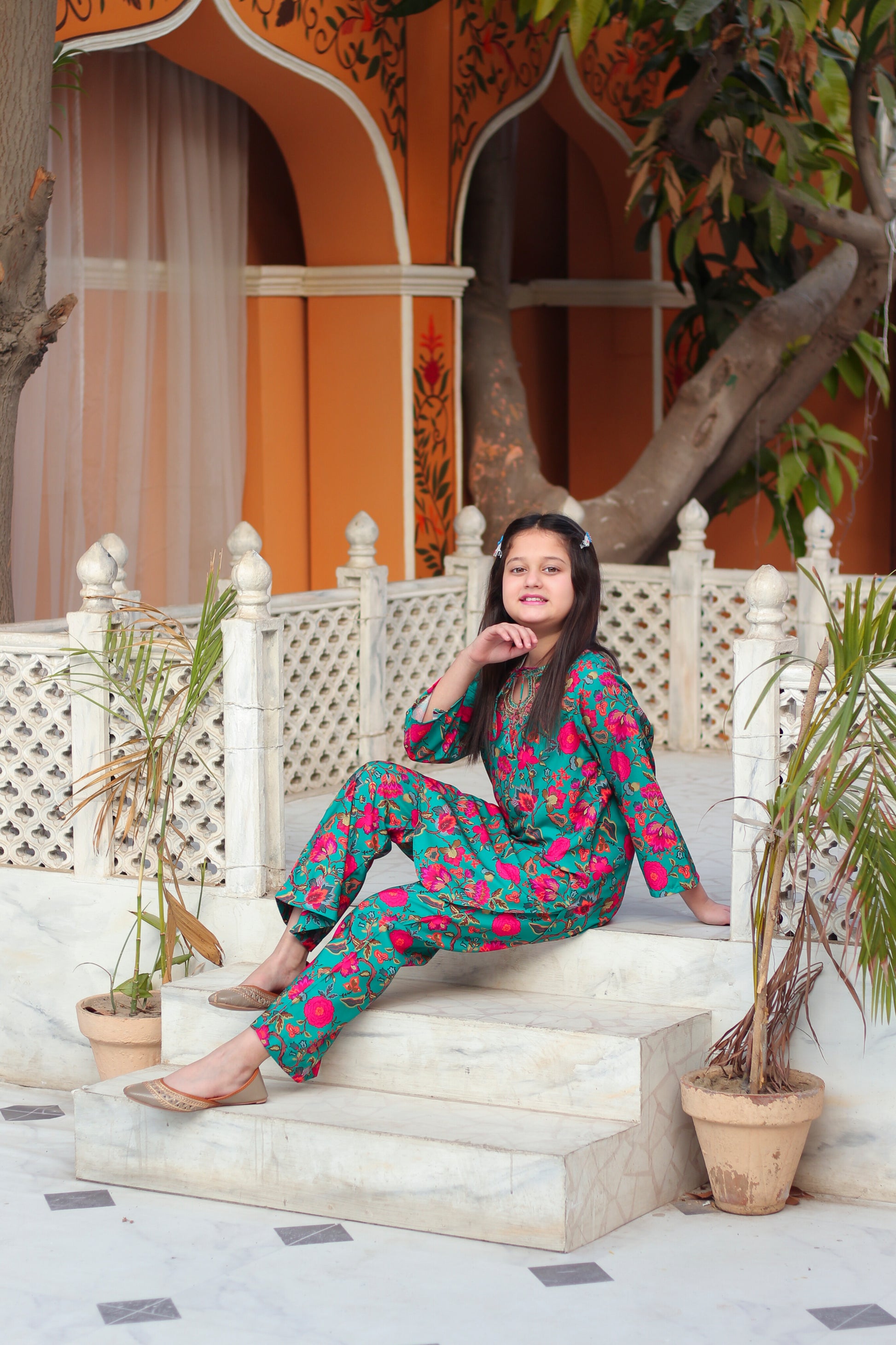 Green Rose Embroidered Short Shirt - 2pc Digital Print