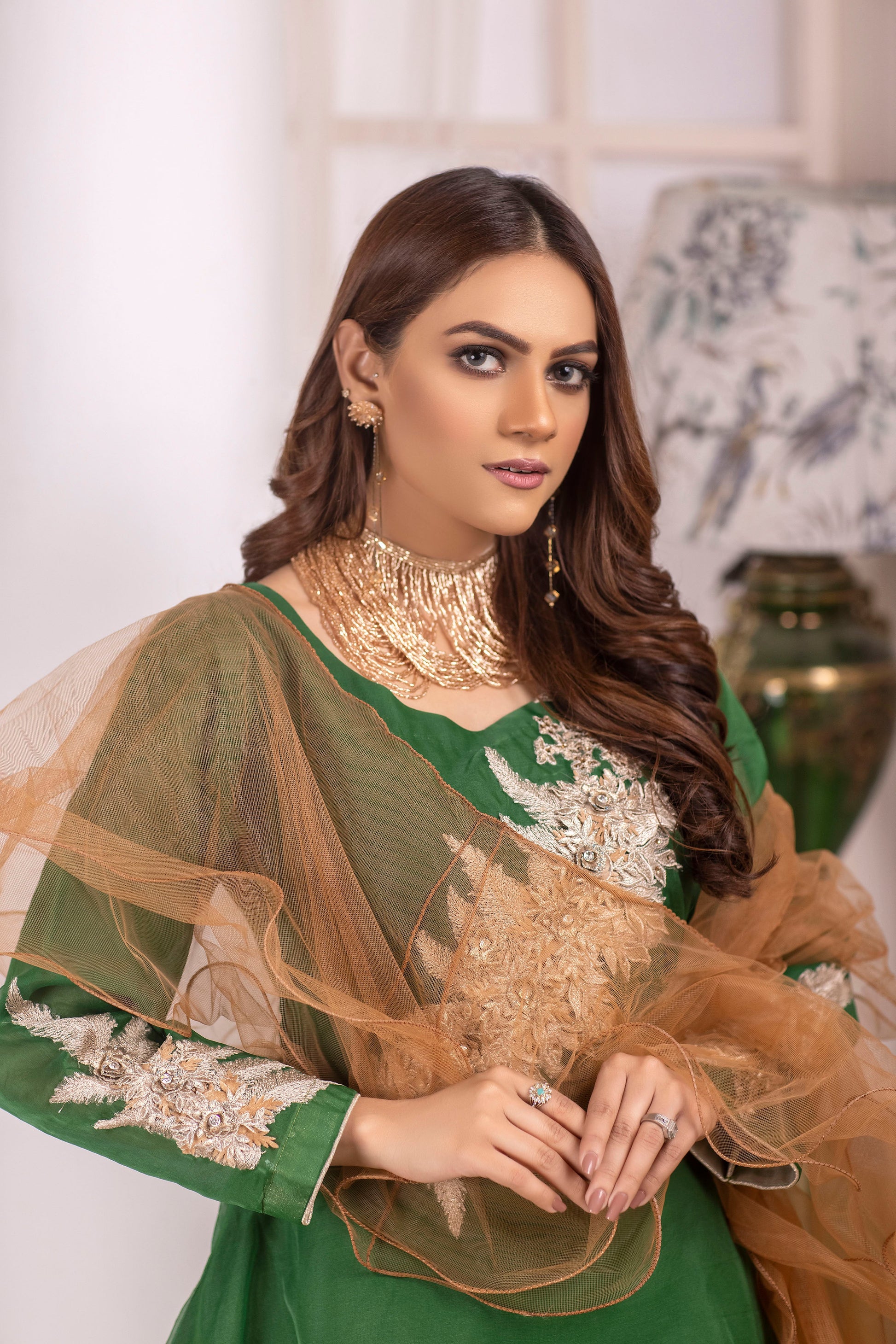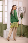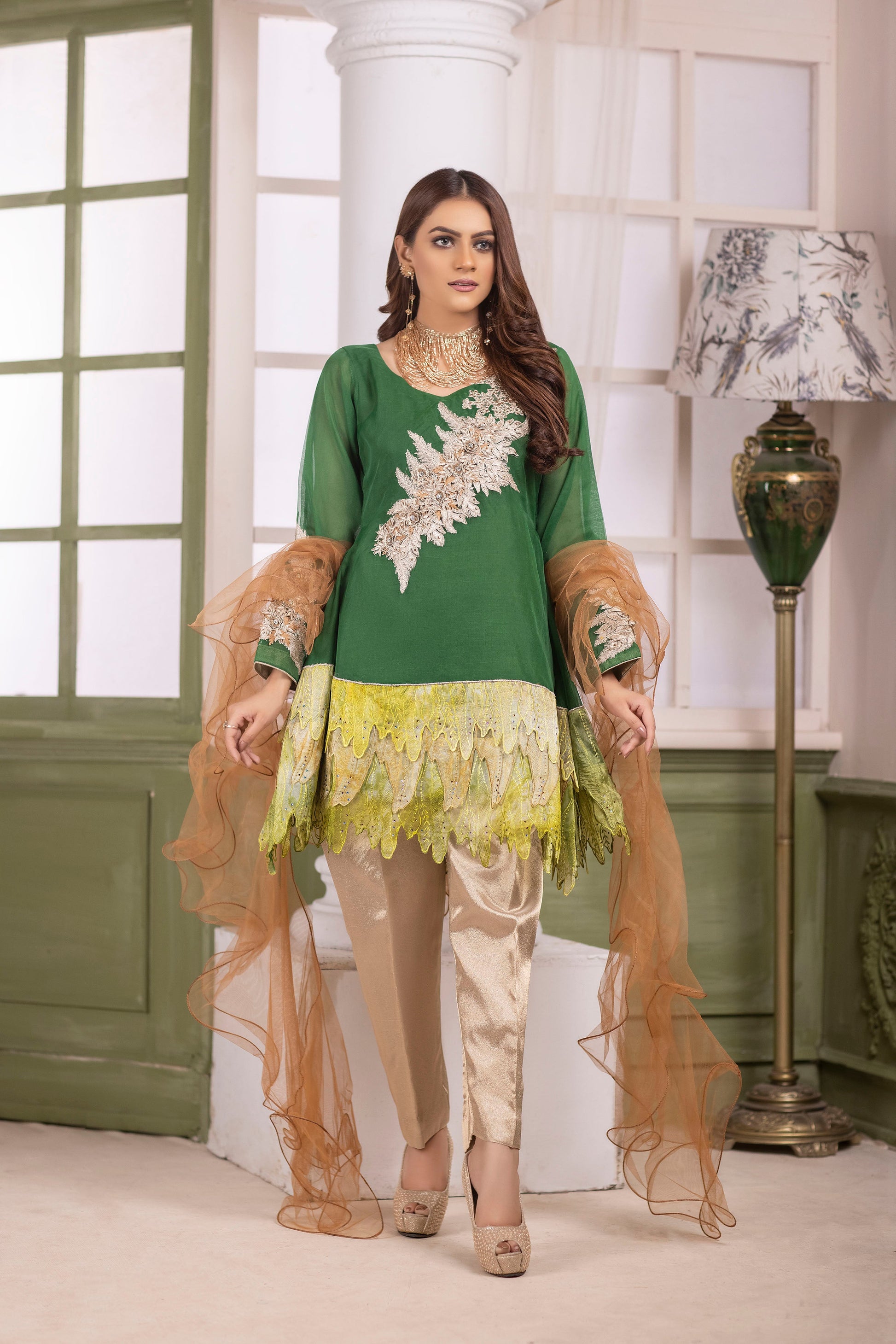 SHIRT: ORGANZA SHIRT WITH FLARE DAMAN AND HANDWORK ON SLEEVES DAMAN AND FRONT WITH LACES AND PEARLS