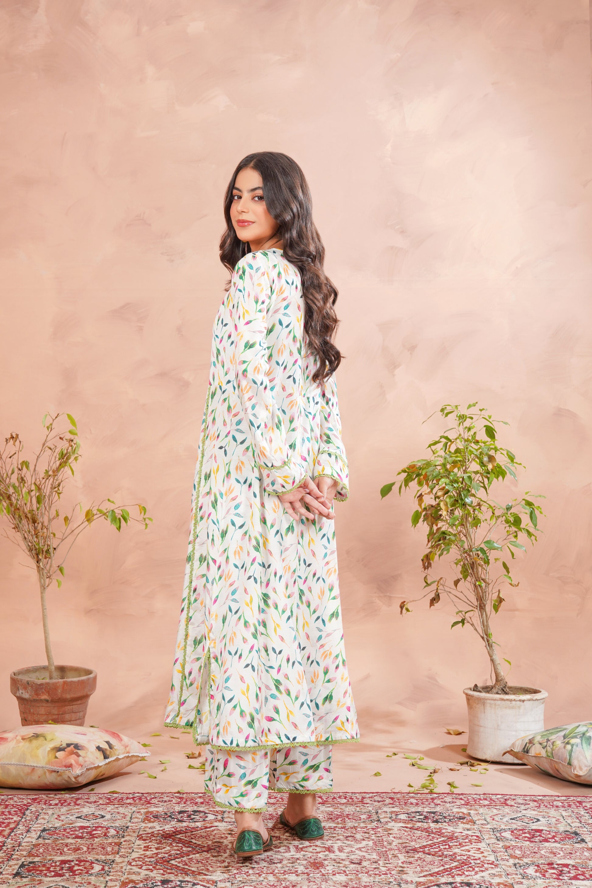 Leafline - Off-White Multi Leaf Print Raw Silk Pishwas Set