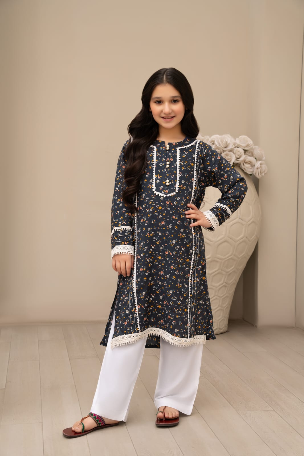 - *Top:* A dark-hued kurti featuring a delightful floral print, complemented by intricate white detailing along the borders and neckline.