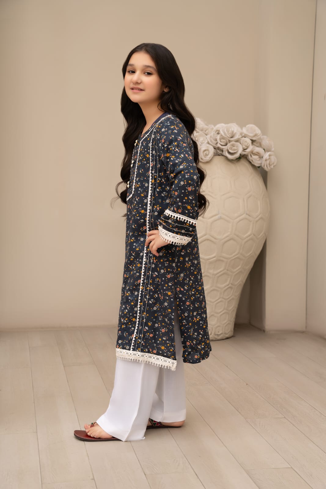 This linen printed suit is a testament to classic style with a contemporary twist. The dark floral kurti is a visual feast, with white accents that highlight the craftsmanship. The plain white trousers are a seamless match, creating an ensemble that's both balanced and bold. Whether you're attending a daytime event or an evening gathering, this 2-piece suit promises to keep your princess looking poised and polished.