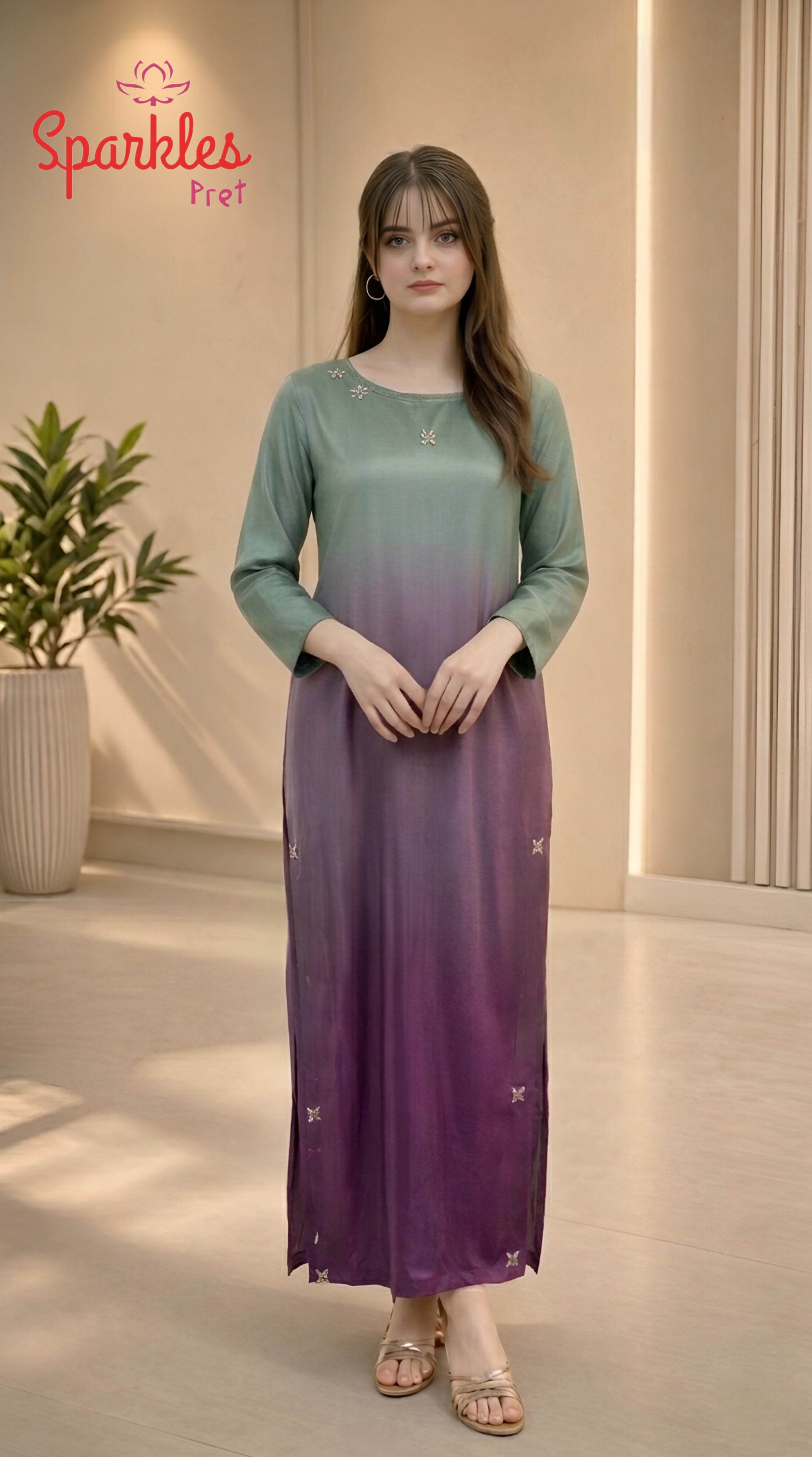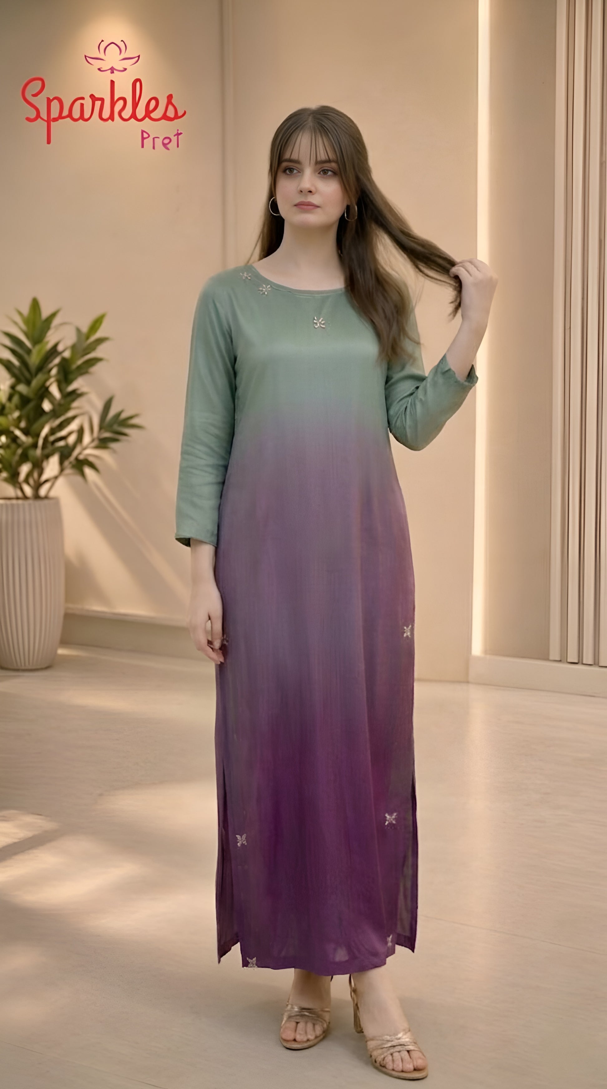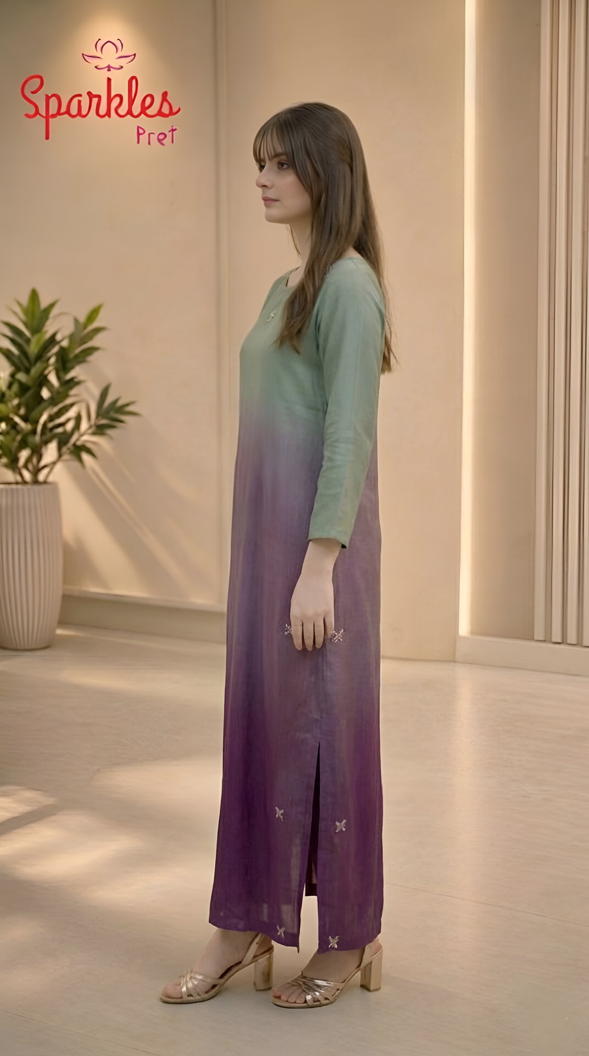 A statement in modern elegance — this ombré long shirt blends soft sage into a rich amethyst hue, creating a look that is both refined and effortlessly luxurious.