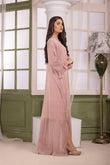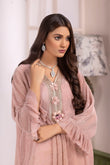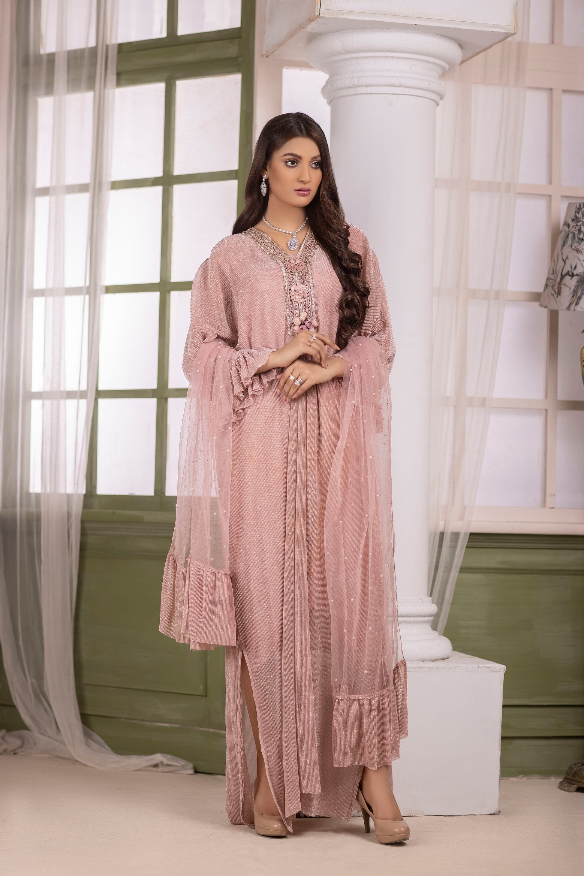 SHIRT: PEACH MOON LIGHT FABRIC WITH EMBELLISHMENT LEATHER MOTIVES & FANCY LACES ON NECKLINE AND ORGANZA WITH ATTACHED LINING.