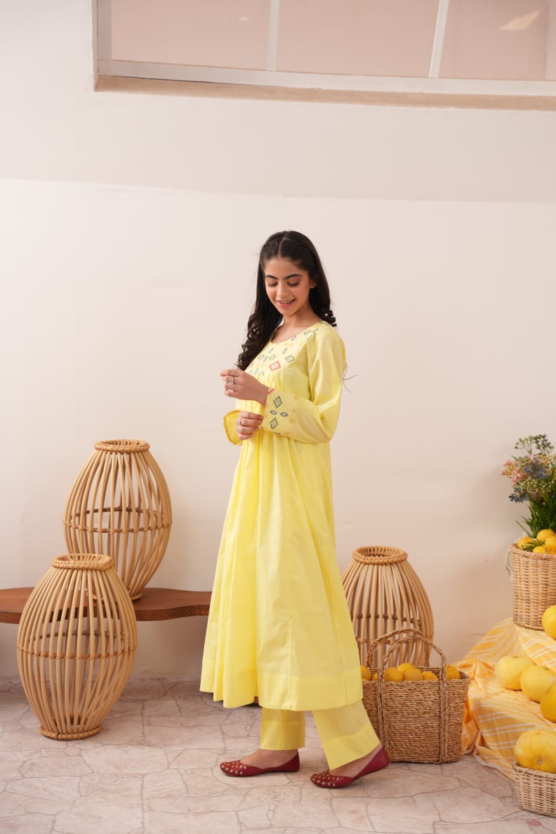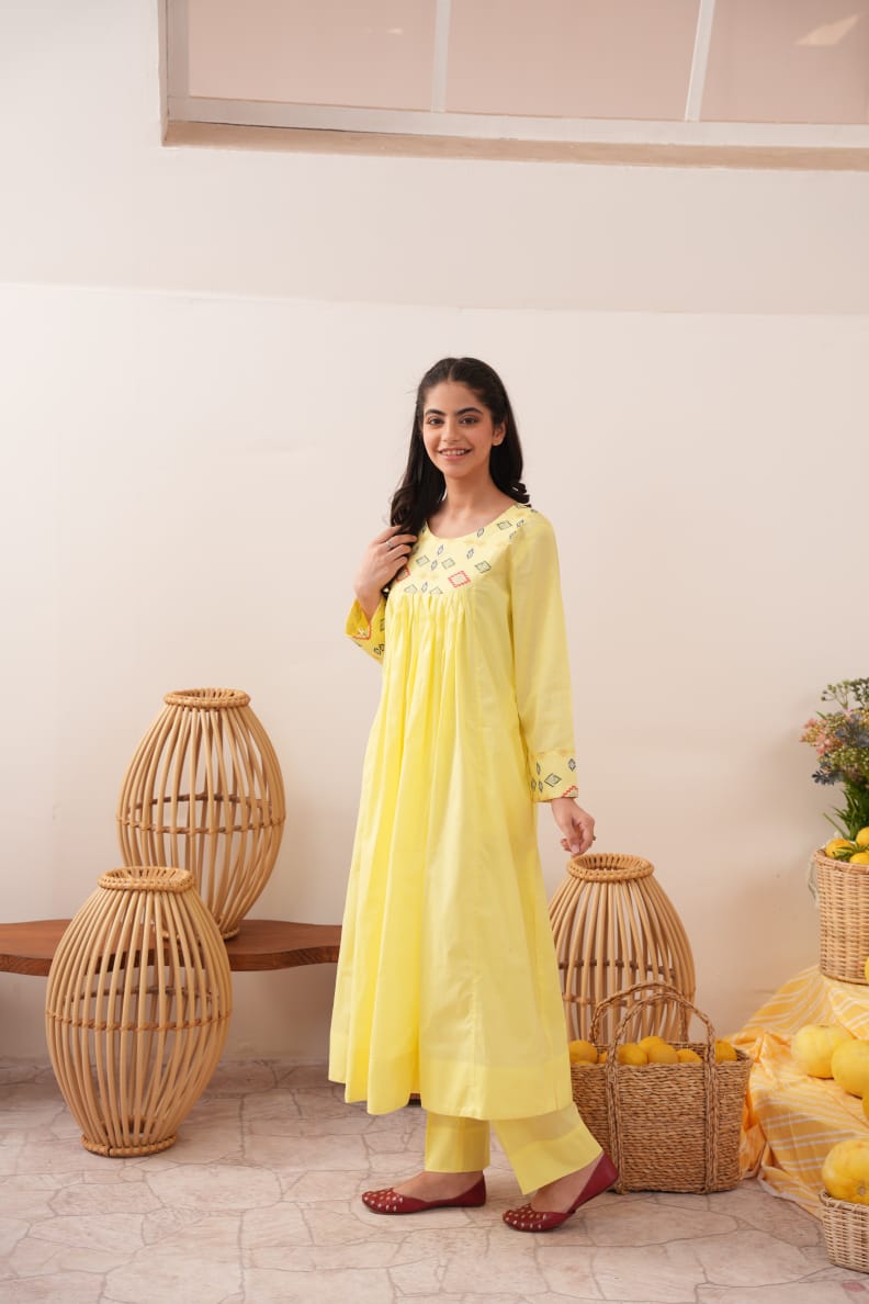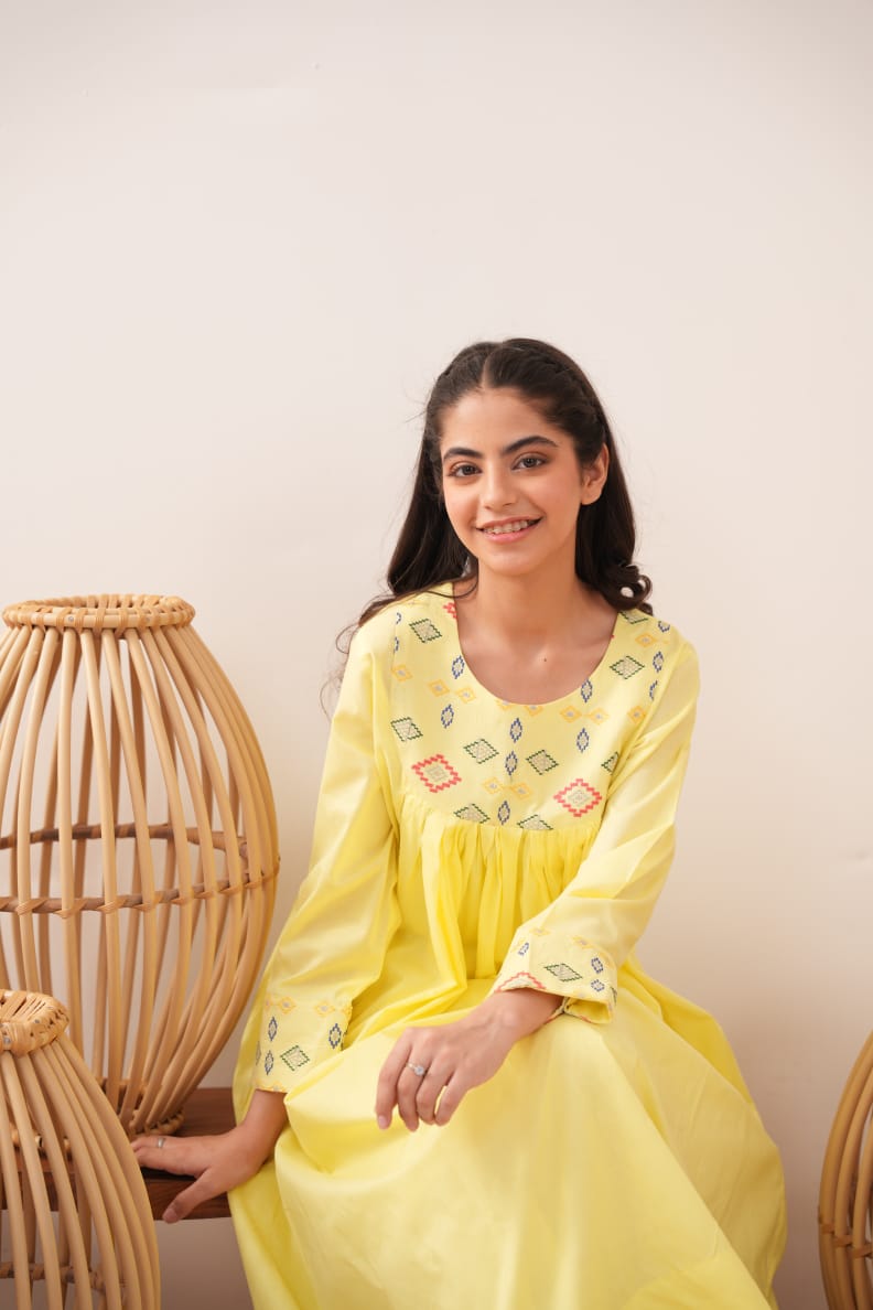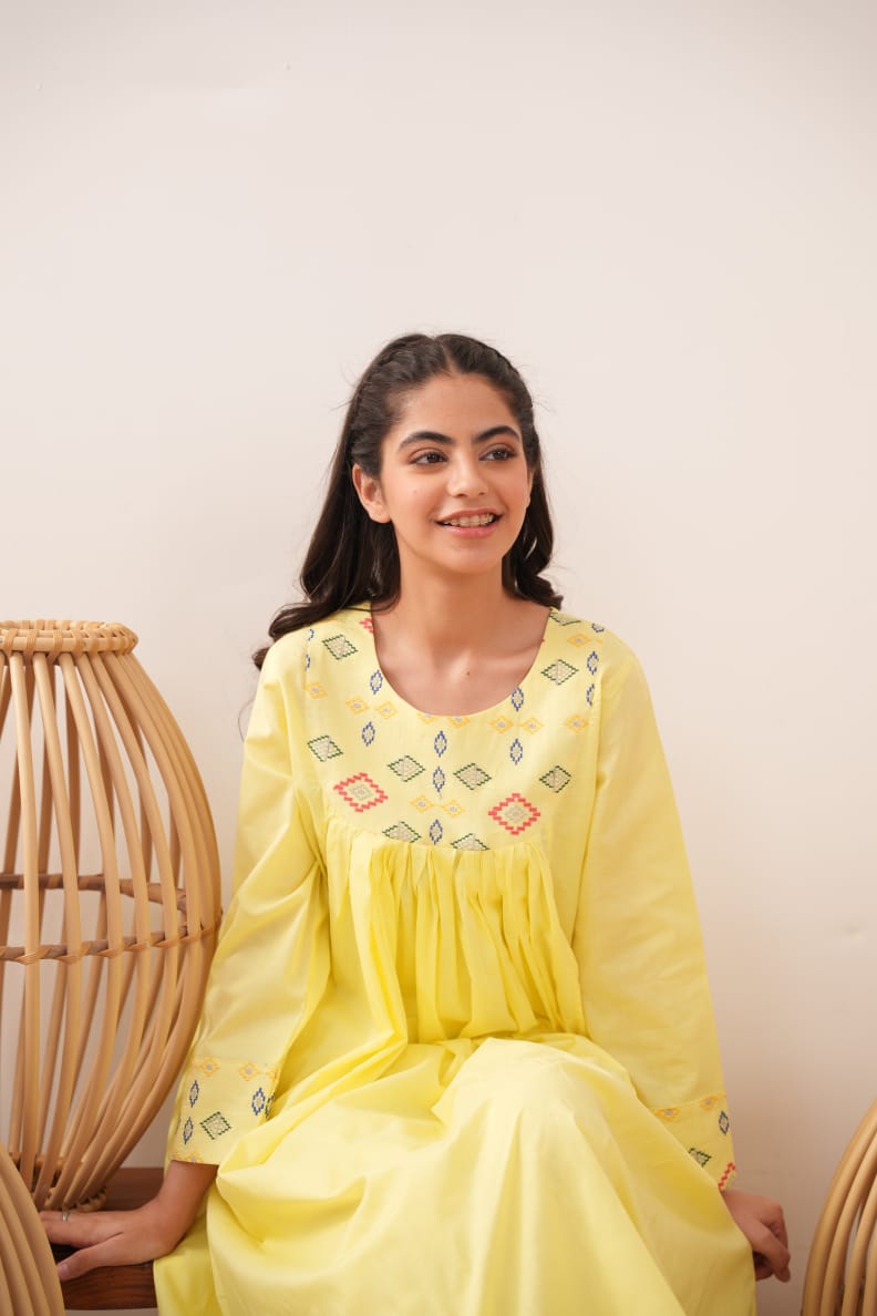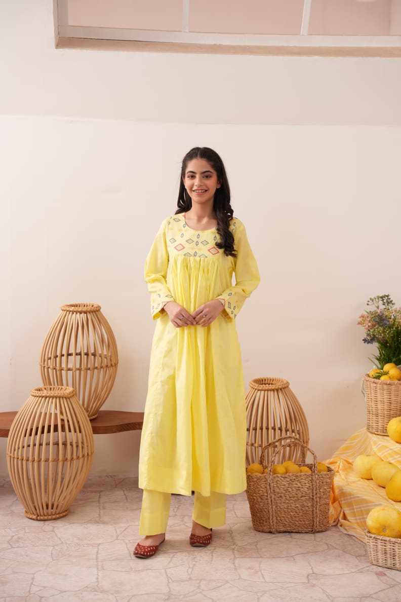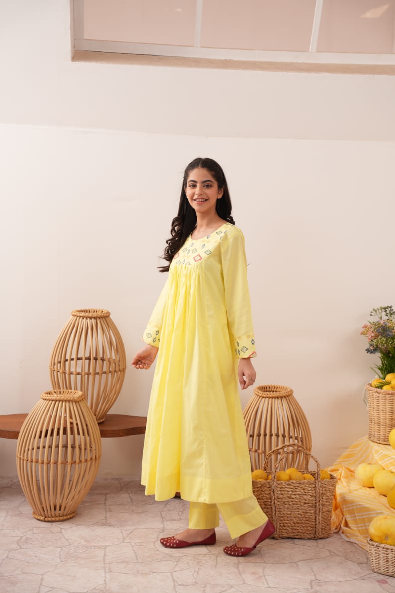 Shop this elegant yellow women's cotton pret collection in your perfect fit (S, M, or L) and experience the perfect balance of quality and style at https://sparklespret.pk today!
