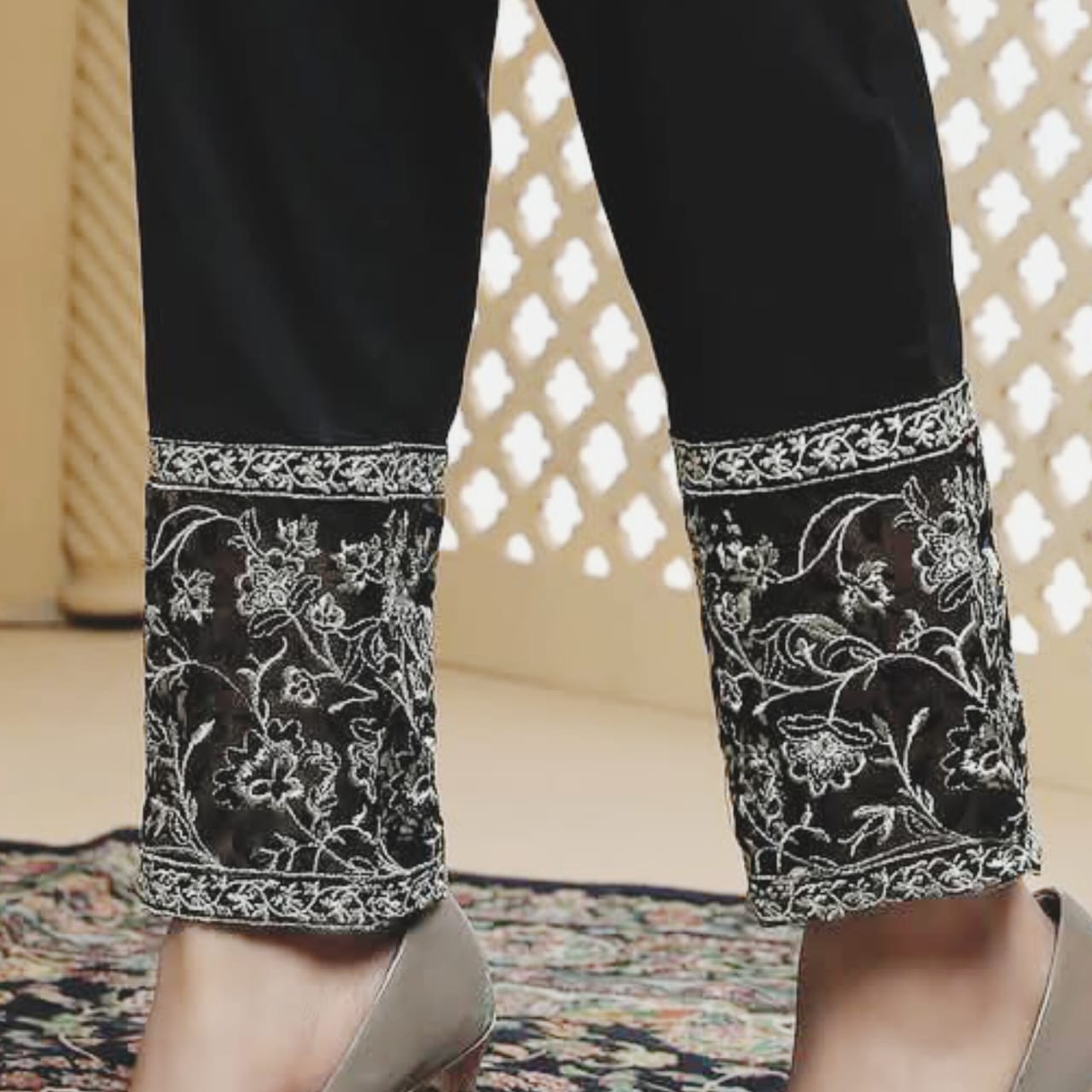 Whether paired with a crisp white blouse for a chic office look or a sequined top for a glamorous evening ensemble, the "Noir Elegance Embroidered Trousers"