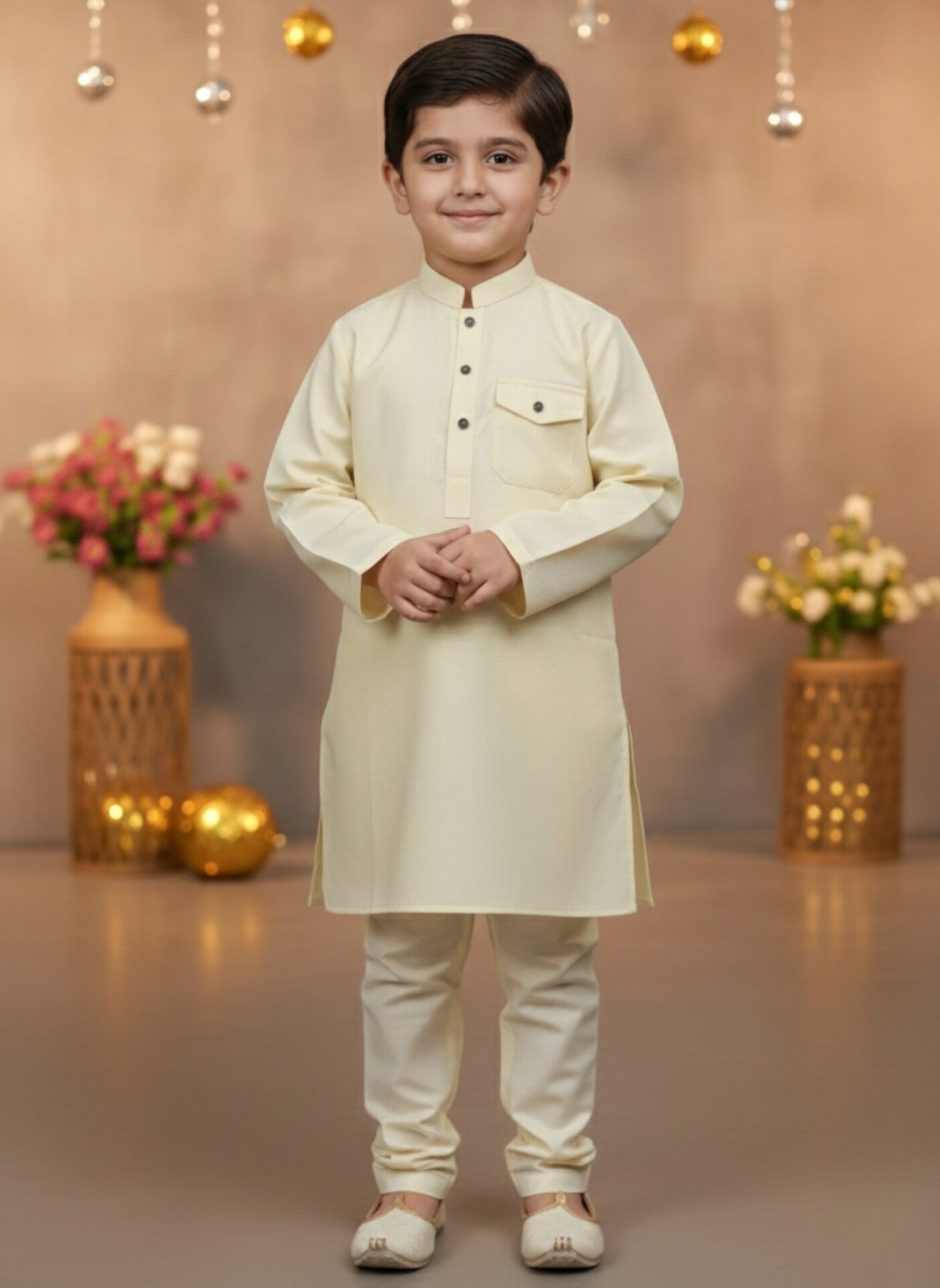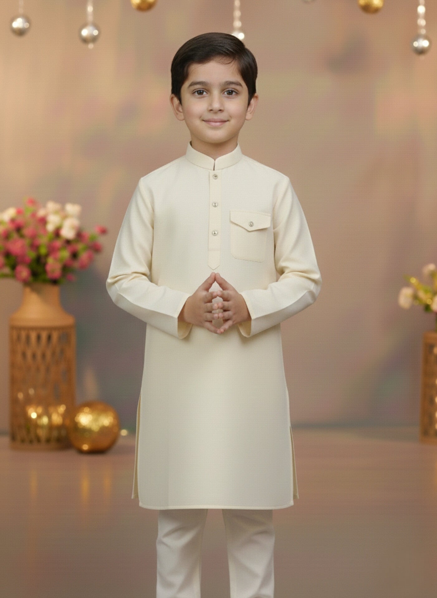 Step into timeless elegance with Pasha Prince, a refined boys’ ensemble from Sparkles Pret. Rendered in a graceful Rich Cream (Soft Light Yellow) shade, this Wash & Wear summer set is designed to deliver a regal look with lightweight comfort—perfect for warm-weather occasions.