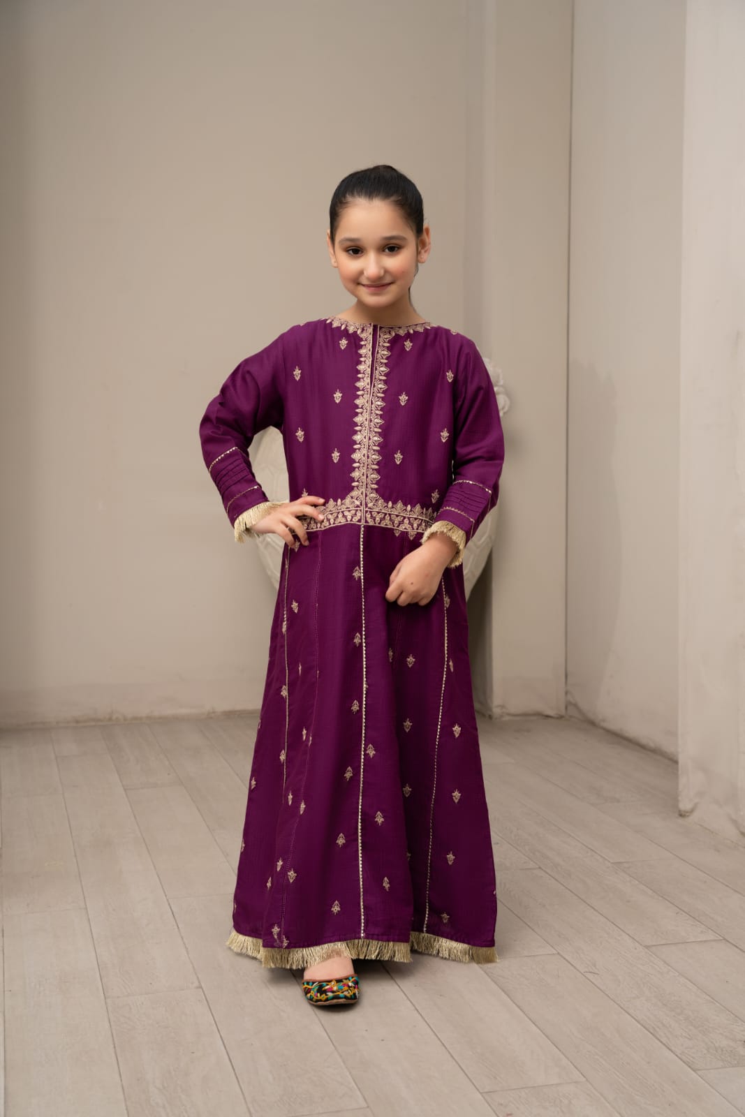 - *Design:* The maxi boasts a rich purple base, adorned with golden embroidery that exudes elegance.