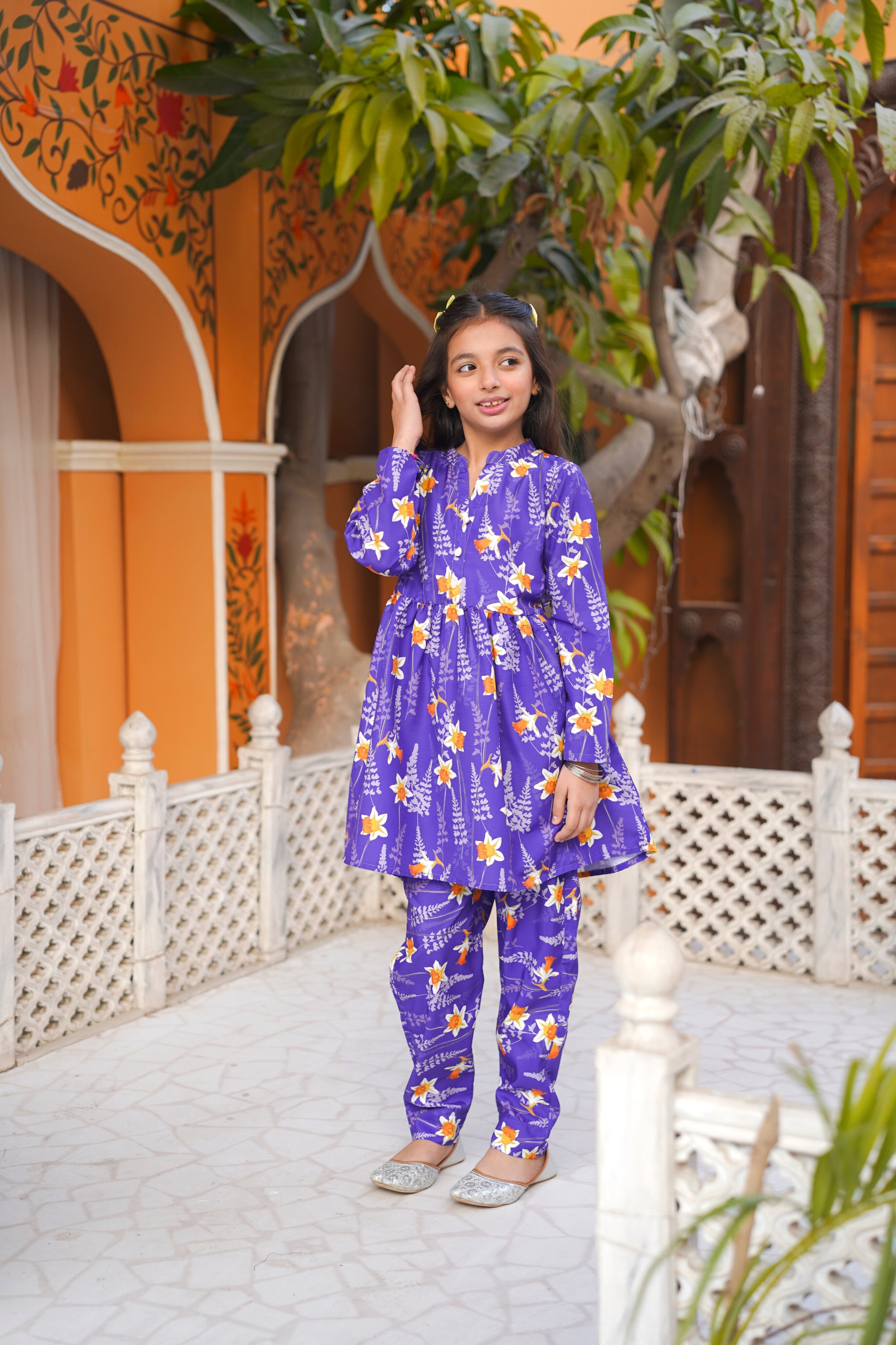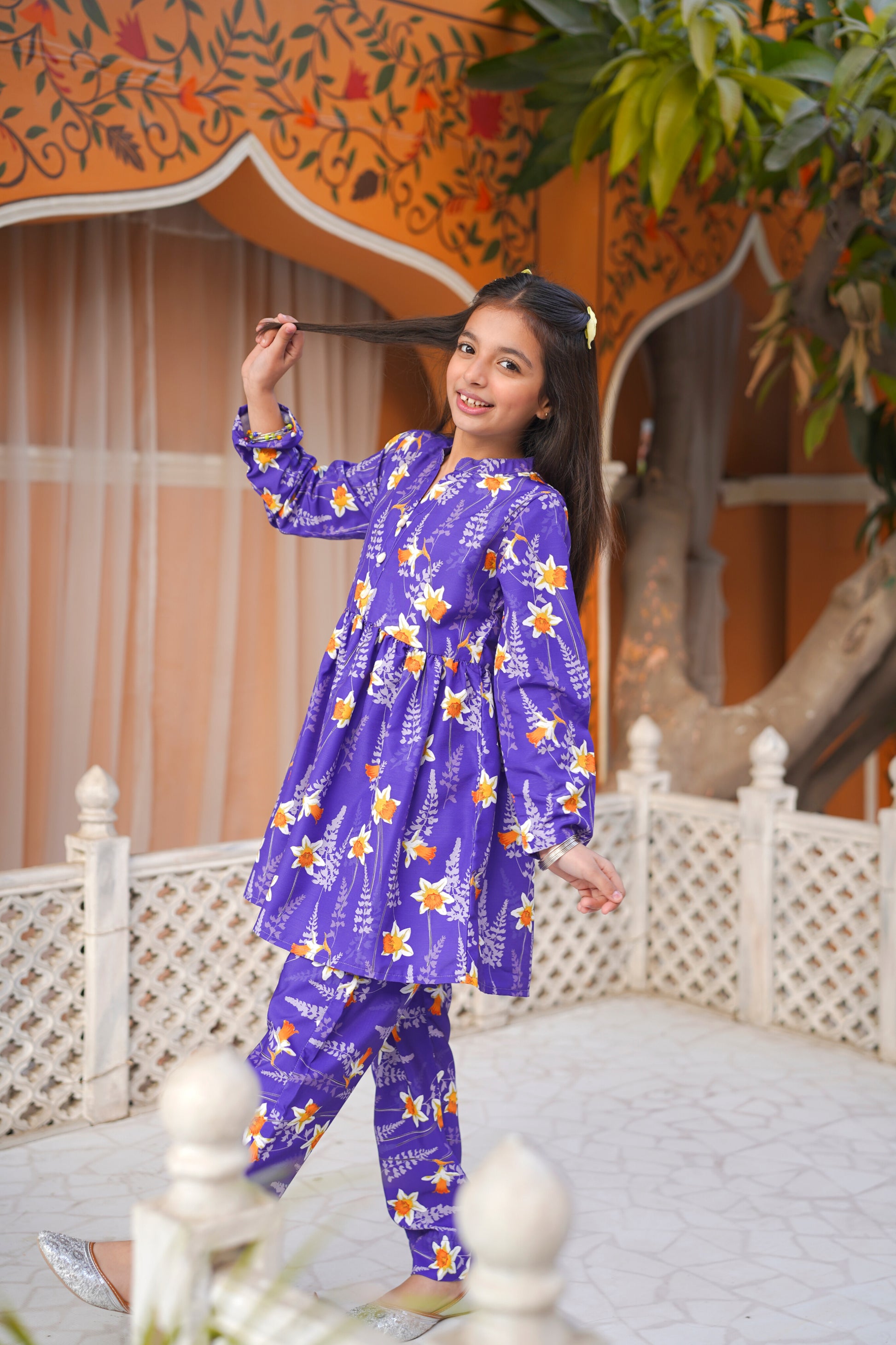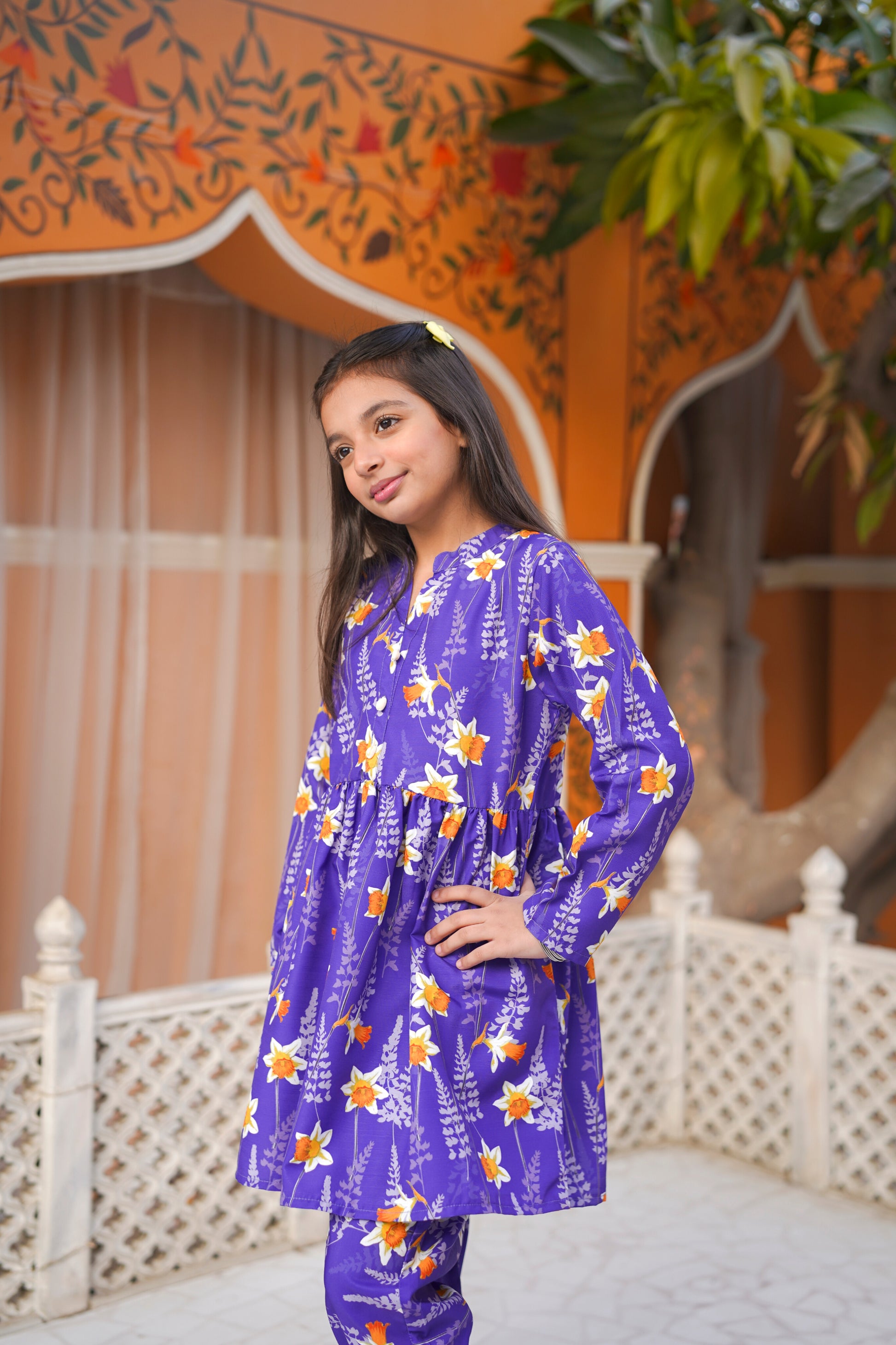Make a statement with our Purple Daffodil Short Frock. This 2-piece set features a deep, royal purple base adorned with striking golden-yellow daffodil digital prints, offering a look that is both energetic and elegant.