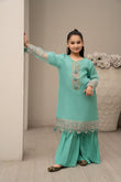 Paired with the shirt are elegant raw silk sharara, tailored to complement the top with their flared design and matching hue. Together, they create a harmonious blend of luxury and playfulness, perfect for your daughter's next festive occasion.