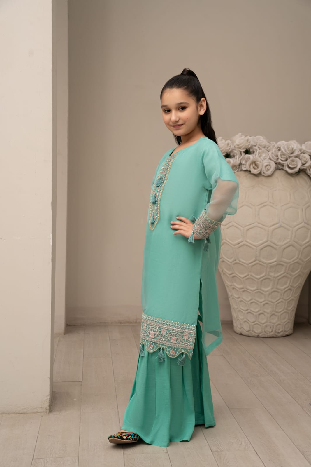 Embrace the ethereal beauty of our Sea Breeze Elegance Set, where the delicate touch of organza meets the timeless grace of raw silk. This two-piece ensemble features a sea green organza shirt, adorned with exquisite embroidery and sparkling embellishments that cascade down the neckline and sleeves. The shirt's airy silhouette is both enchanting and comfortable, allowing your little girl to move with ease.