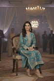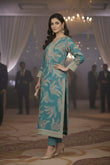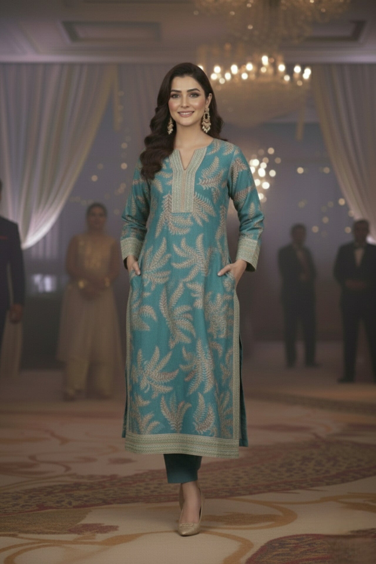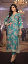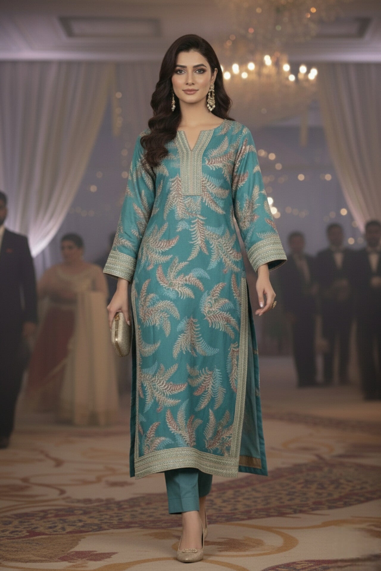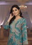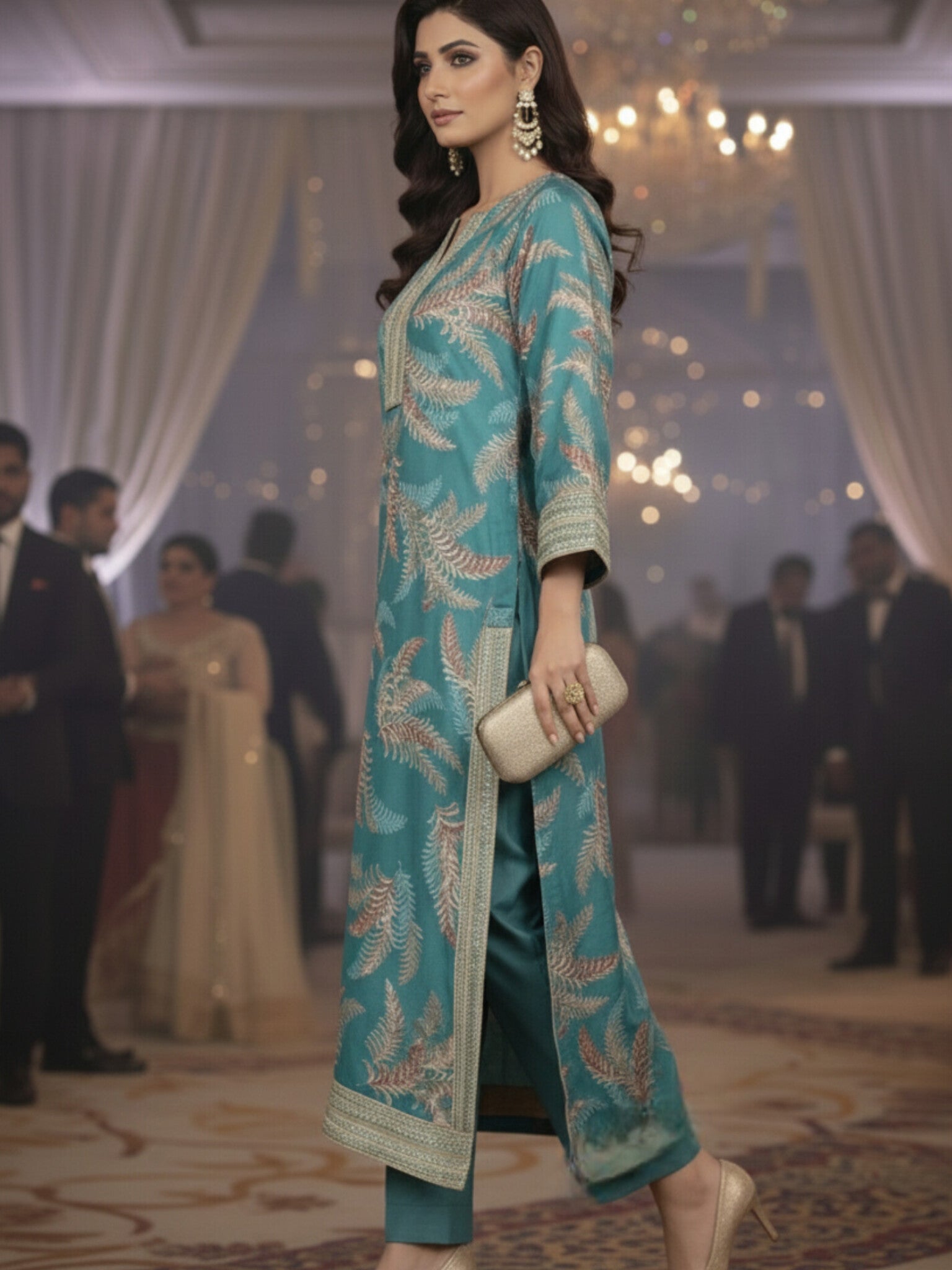 The Silk Signature Pista Green suit showcases a captivating botanical fern print that flows seamlessly across the silhouette. The shirt is enhanced with a structured geometric border along the neckline, sleeves, and daman, providing a sophisticated frame to the organic patterns.