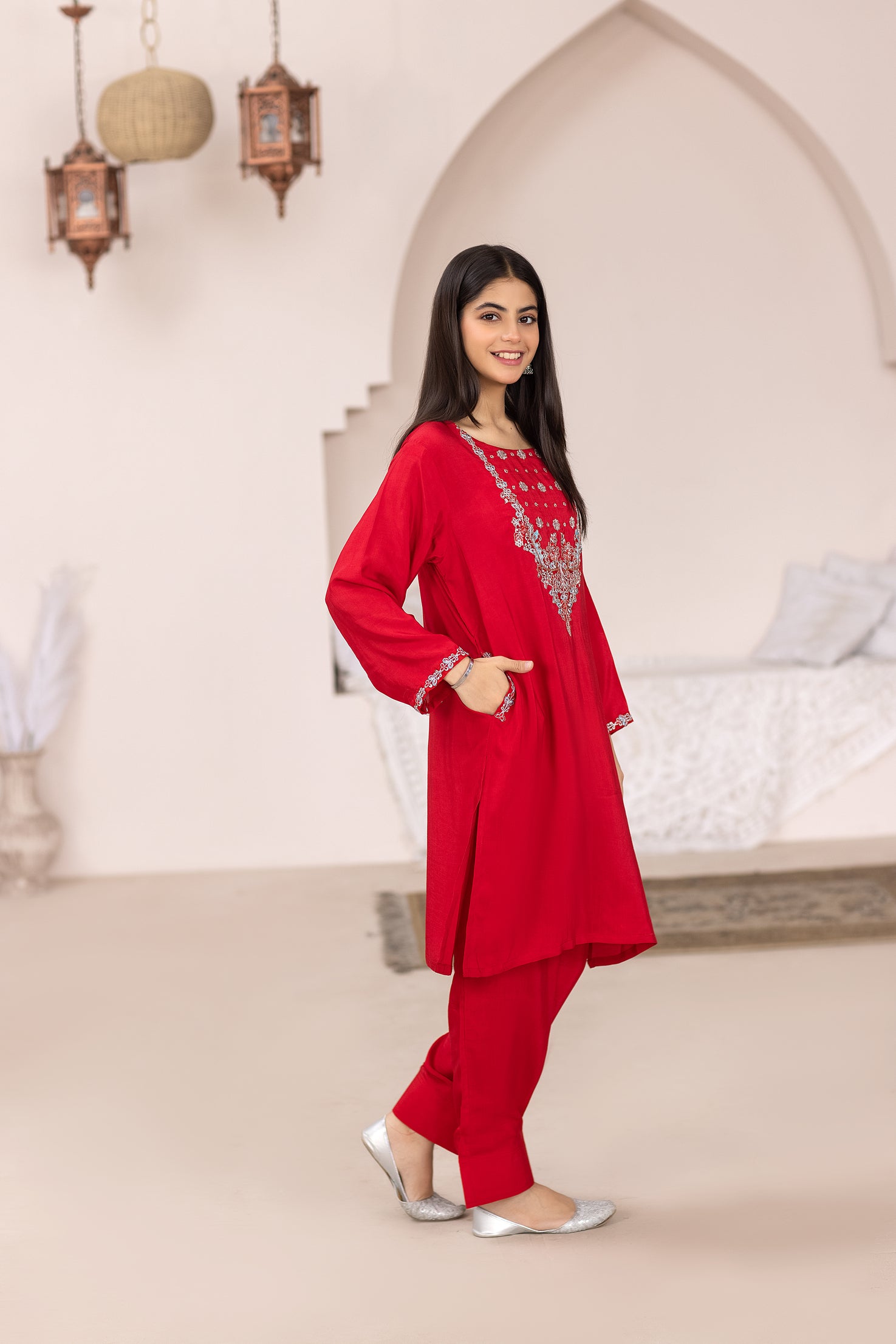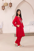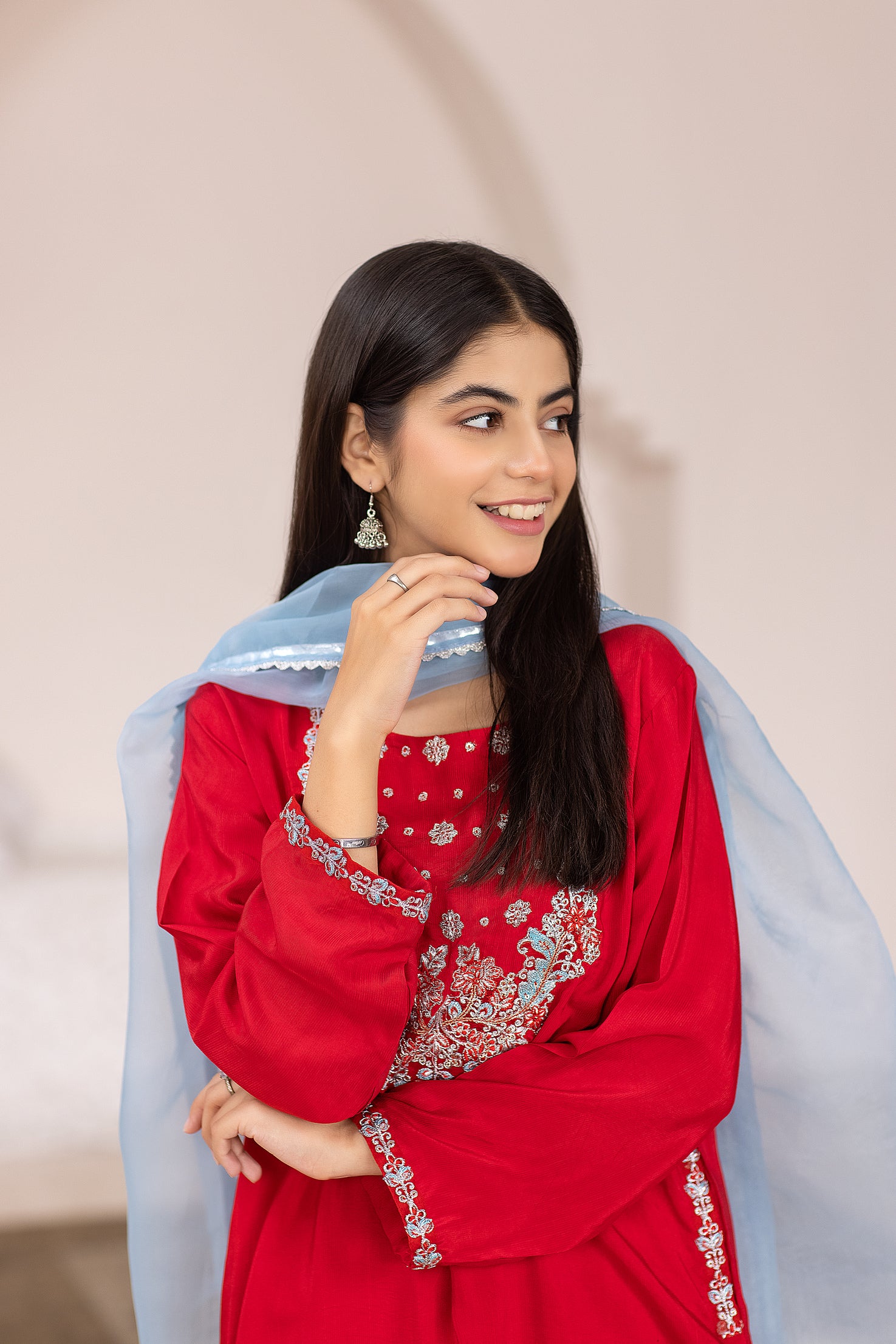 This vibrant Sparkling Rose Rawsilk Ensemble in red is the perfect addition to any young girl's wardrobe. Made with comfortable and easy rawsilk fabric, this 2-piece set features intricate embroidery and is perfect for girls ages 7-18, making it a stylish choice for parties and Eid celebrations. Elevate their fashion with Sparkles Pret.