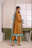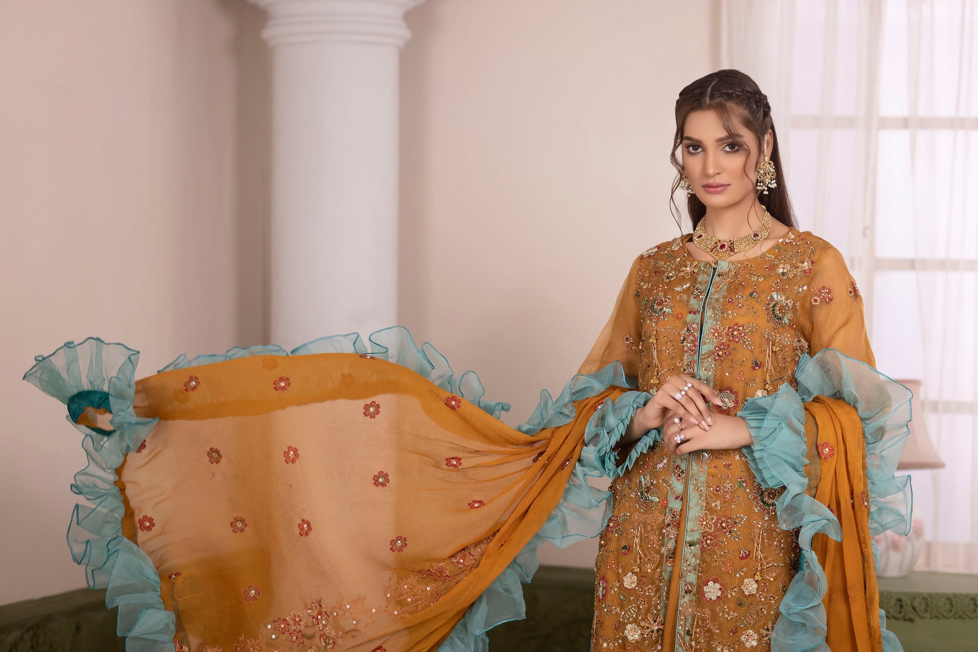 DOPATTA: MUSTARD CHIFFON DOPATTA WITH HANDMADE EMBELLISHMENT AND DETAILING WITH AQUA ORGANZA.
