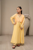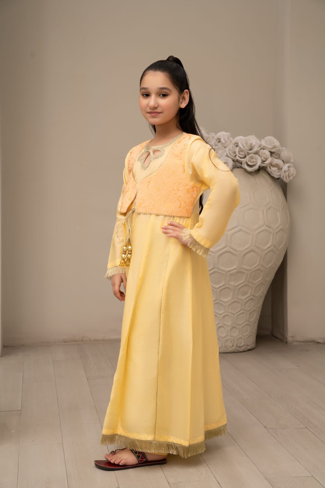 Discover the charm of our Sunshine Elegance Set, a two-piece outfit that radiates joy and sophistication. This ensemble features a beautiful long yellow jacket seamlessly attached to a matching shirt, both crafted from the softest cotton. The jacket is adorned with intricate designs on the chest, adding a touch of artisanal flair to this cheerful set.