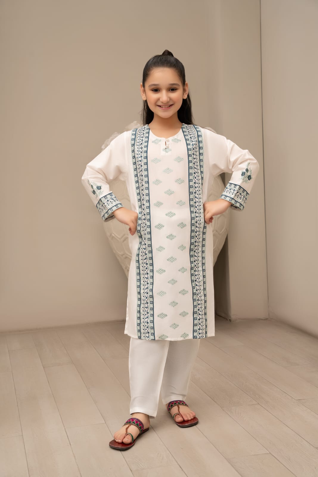 - *Trousers:* Complementing the kurti are plain white trousers, tailored for a comfortable and stylish fit.